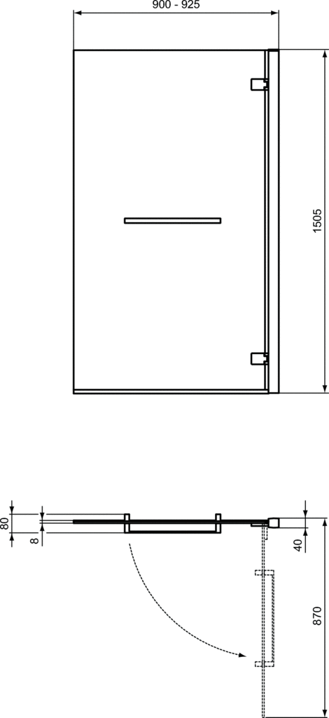 Parawan nawannowy Ideal Standard i.life z zawiasami, wysokość 1500 mm. Wykonany z transparentnego szkła 8 mm z powłoką ułatwiającą czyszczenie z poziomą poręczą na ręcznik (450 x 20 mm). Grubość profila: 1,2 mm, regulacja ułatwiająca dopasowanie do 25 mm, z ukrytymi śrubami (maskowanie na każdej stronie profilu ściennego). Parawan otwiera się tylko na zewnątrz. Zawias mocowany do ściany. WAŻNE: z uwagi na zawias mocujący, produkt nie jest odwracalny. Produkt dostępny jest w wersji lewej i prawej.