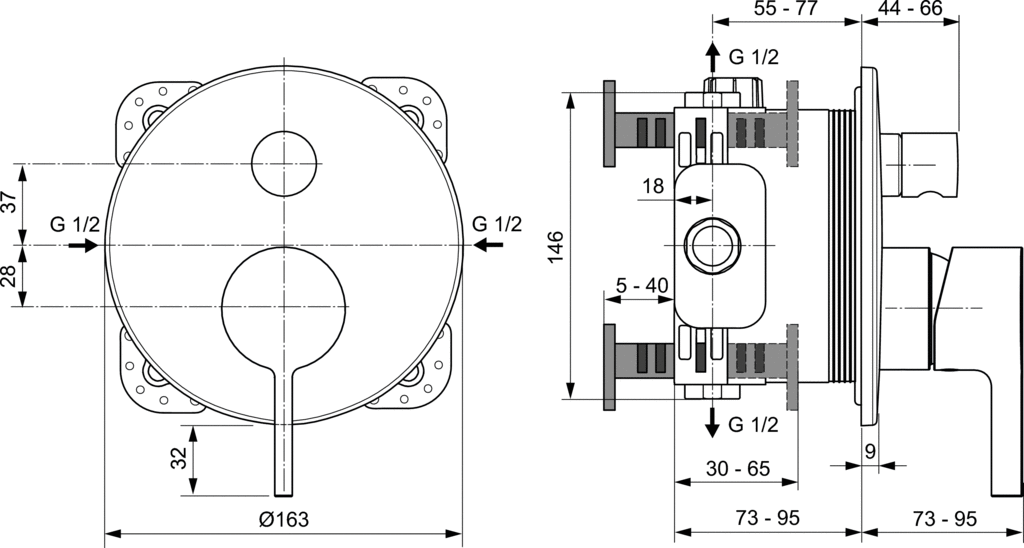 Zestaw montażowy (widoczna część). Głowica 47 mm CLICK z ogranicznikiem temperatury. Cylindryczna metalowa rozeta z logo Ideal Standard. Metalowy uchwyt bez oznaczeń. Automatyczny przełącznik. Do skompletowania z uniwersalnym zestawem podtynkowym EASY-BOX A1000NU.