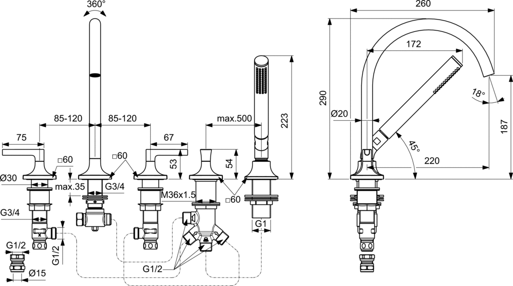 Bateria natryskowo-wannowa 4-otworowa, wylewka, uchwyty dźwigniowe.