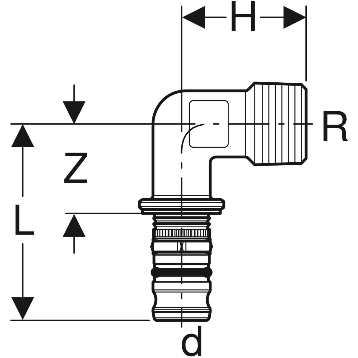 Kolano 90' GEBERIT Mepla, mosiądz / mosiądz, 1'' x 26 mm (GZ gazowy stożkowy x końcówka wciskowa), (głębokość: 27 mm) z uszczelką