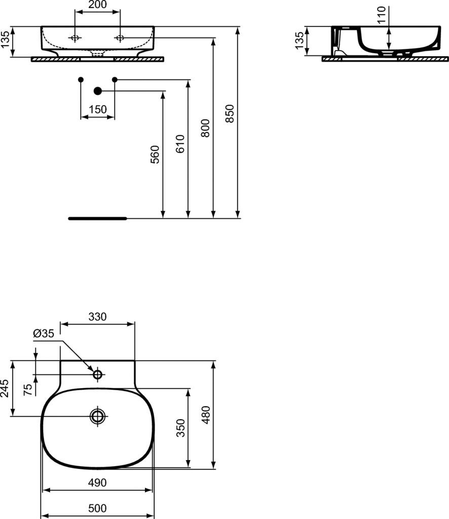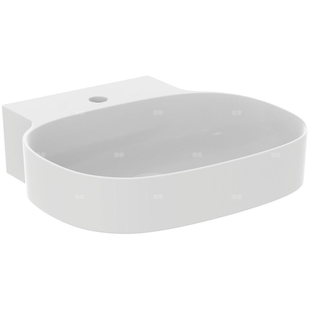 Umywalka Linda-X wisząca do montażu na meblach lub blacie (szlifowany spód). Z wybitym otworem na baterię, bez przelewu. W komplecie szablon do wycinania TT0299731.