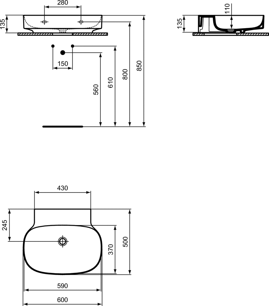 Linda-X umywalka bez otworu na baterię, bez przelewu. Umywalka wisząca, mocowana do ściany, dostosowana do postawienia na płaskiej powierzchni typu blat (szablon w komplecie). Umywalka bez otworu przelewowego, do skompletowania z ukrytym systemem odpływu IdealFlow N8326AA lub niezamykanym odpływem z pokrywą E2114XX.