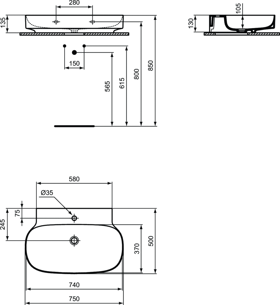 Linda-X umywalka z otworem na baterię, bez przelewu. Umywalka wisząca, mocowana do ściany, dostosowana do postawienia na płaskiej powierzchni typu blat (szablon w komplecie). Umywalka bez otworu przelewowego, do skompletowania z ukrytym systemem odpływu IdealFlow N8326AA lub niezamykanym odpływem z pokrywą E2114XX.