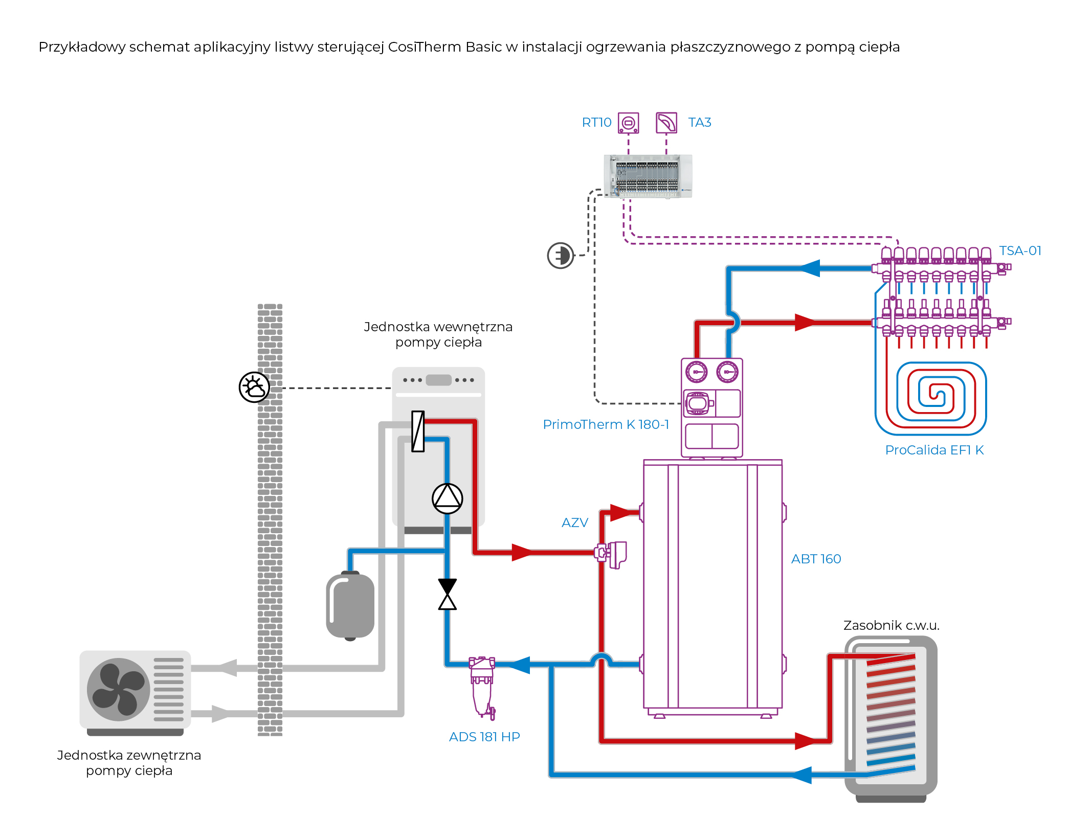 Reguluje temperaturę w pomieszczeniach na podstawie sygnałów z termostatów pokojowych.