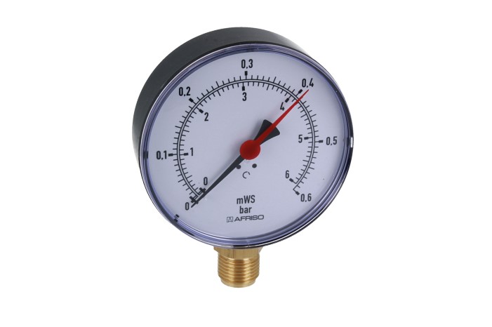 Przyrząd do otwartych instalacji grzewczych. Wyposażony w podwójną skalę (bar i mH2O) i czerwoną przestawną wskazówkę.