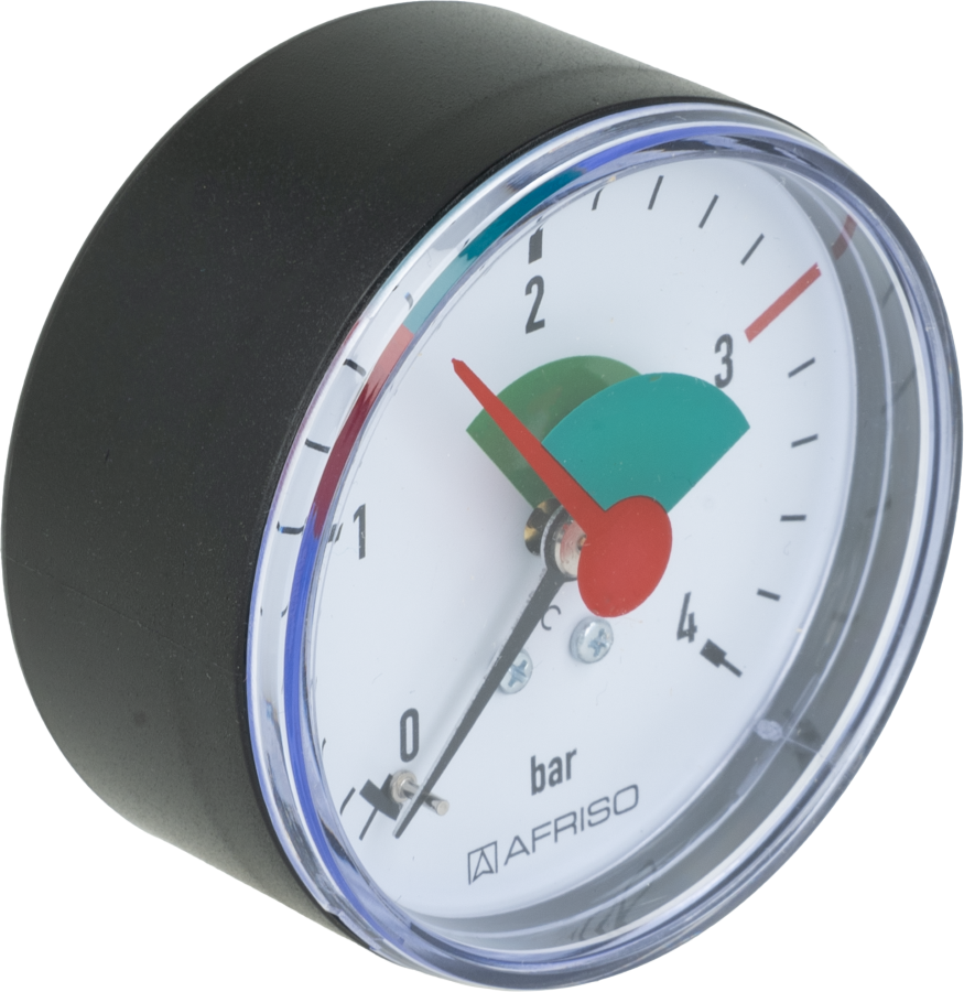 Przyrząd do zamkniętych instalacji grzewczych o Pmax 3 bar. Zielony obszar na tarczy wskazuje optymalny zakres ciśnienia.