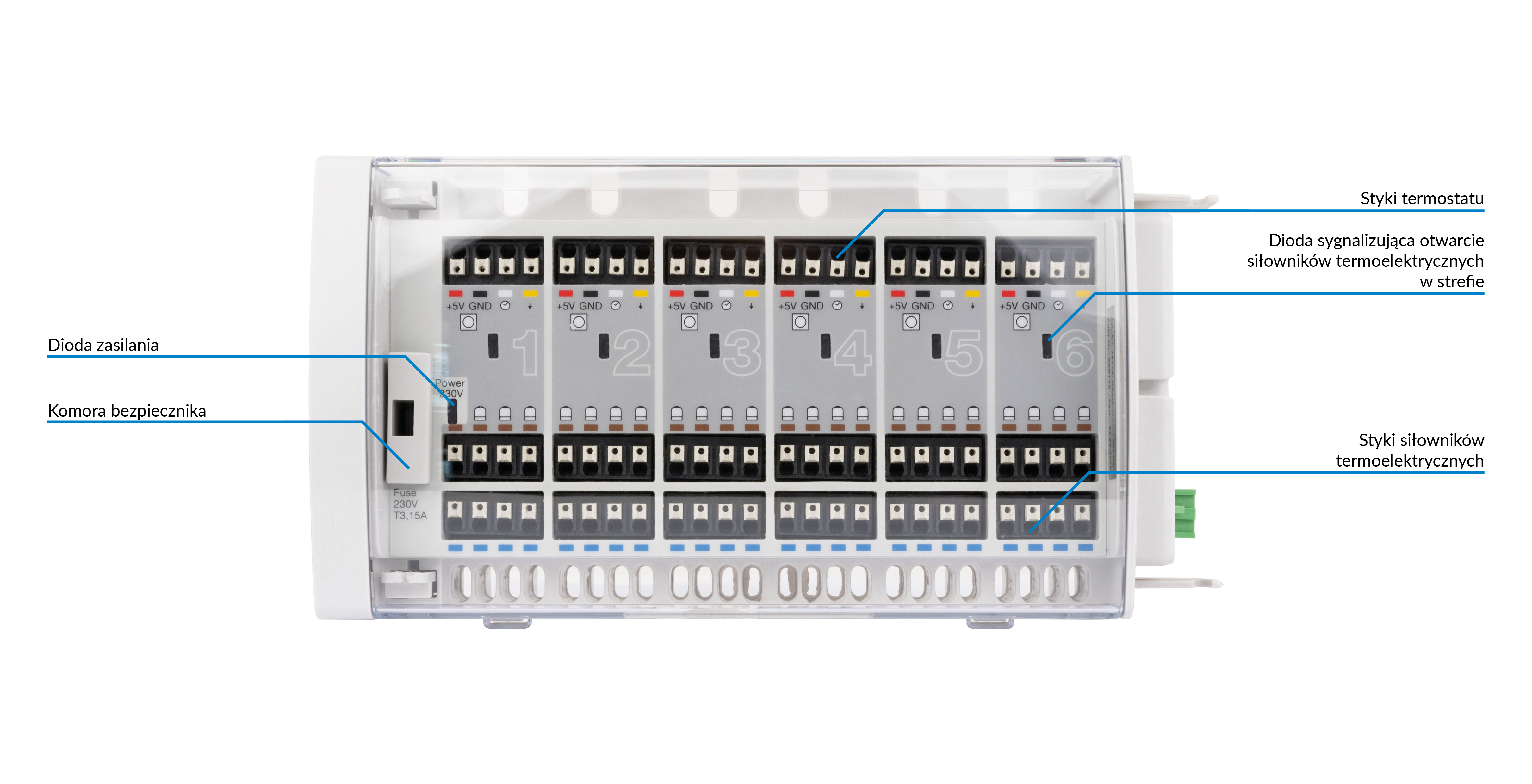 Steruje temperaturą w pomieszczeniach / strefach przez siłowniki termoelektryczne na podstawie sygnałów z termostatów tam umieszczonych.