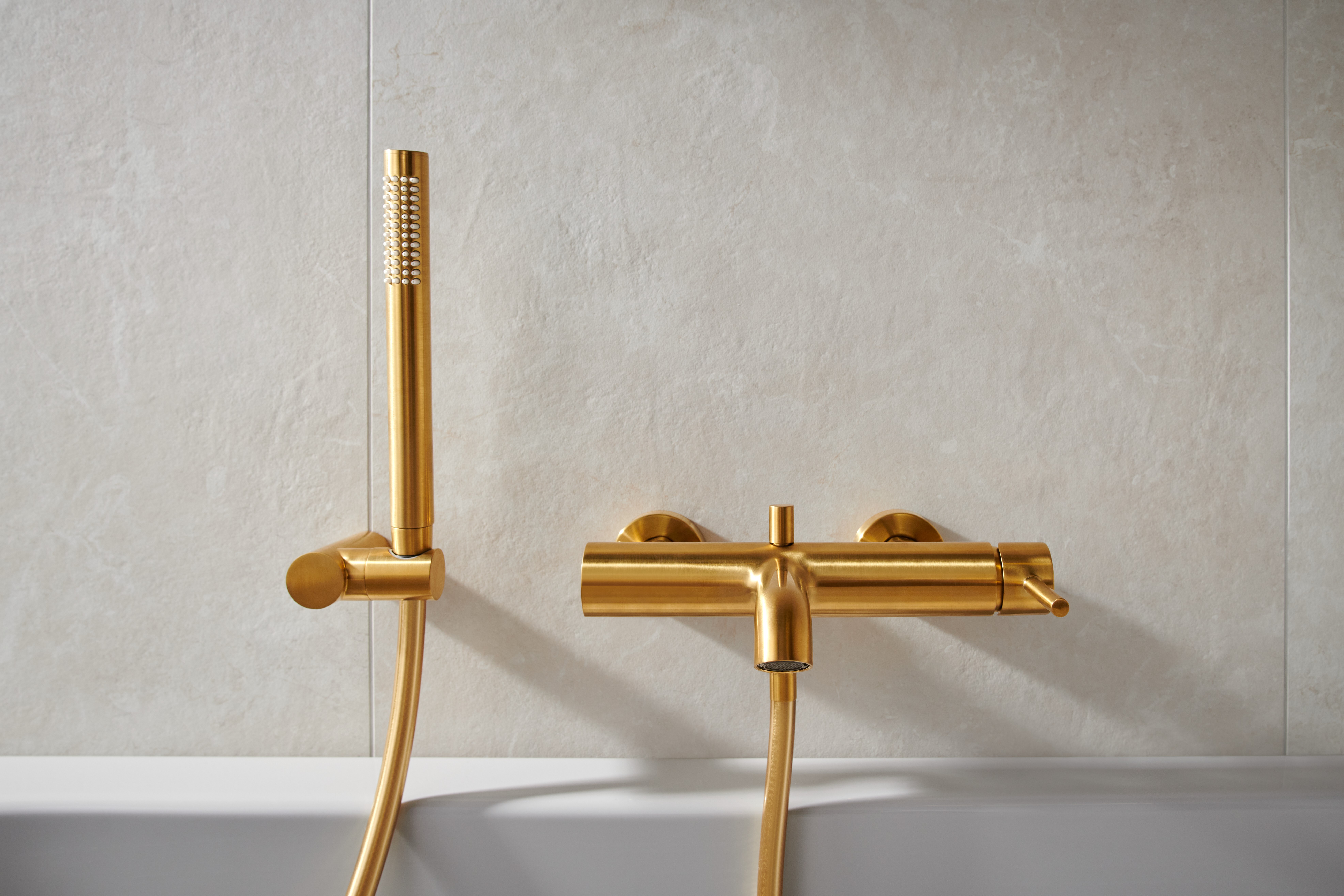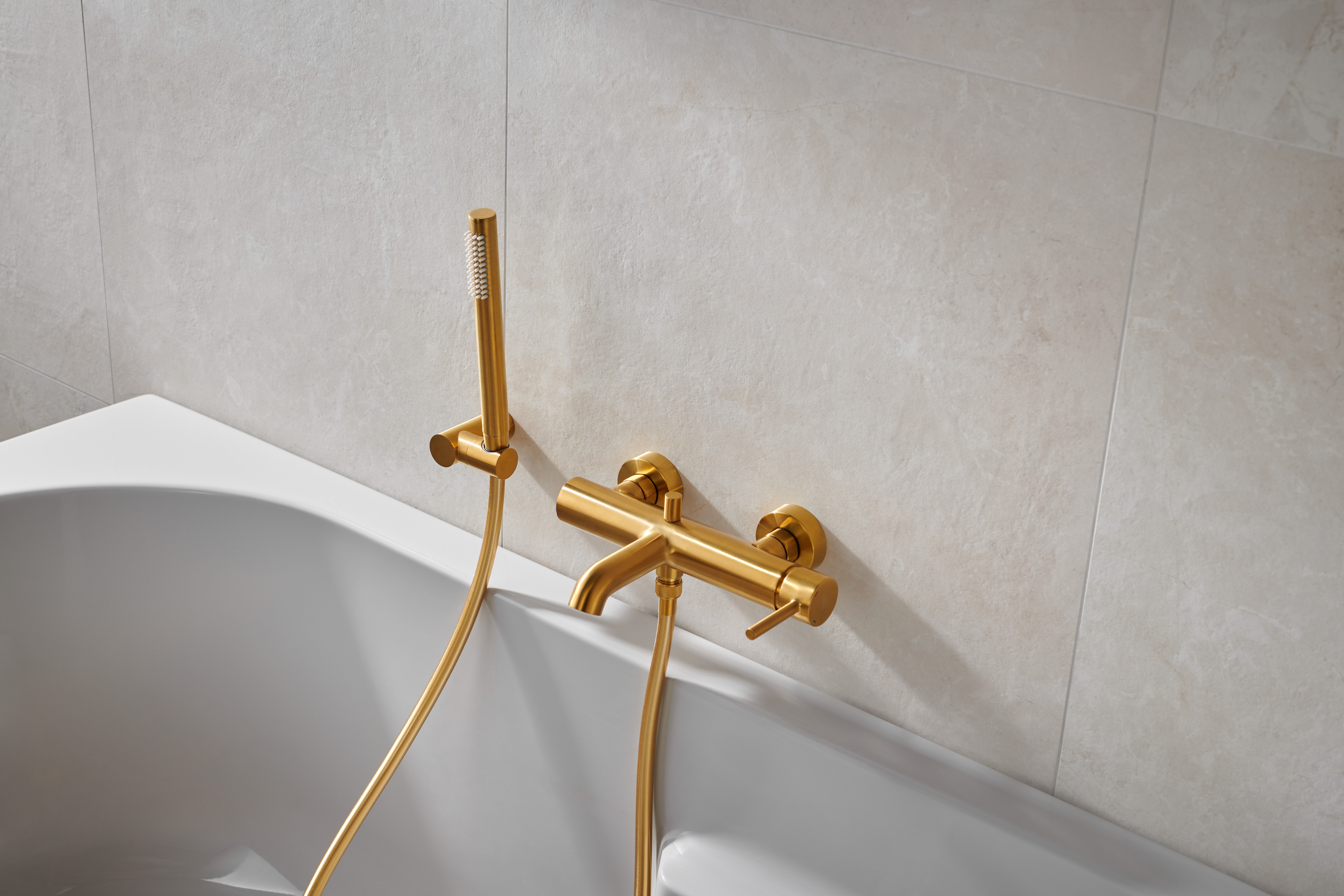 MOZA BATERIA WANNOWA POZIOMA, ŚCIENNA + ZESTAW NATRYSKOWY PUNKTOWY PREMIUM, ZŁOTY SZCZOTKOWANY PVD