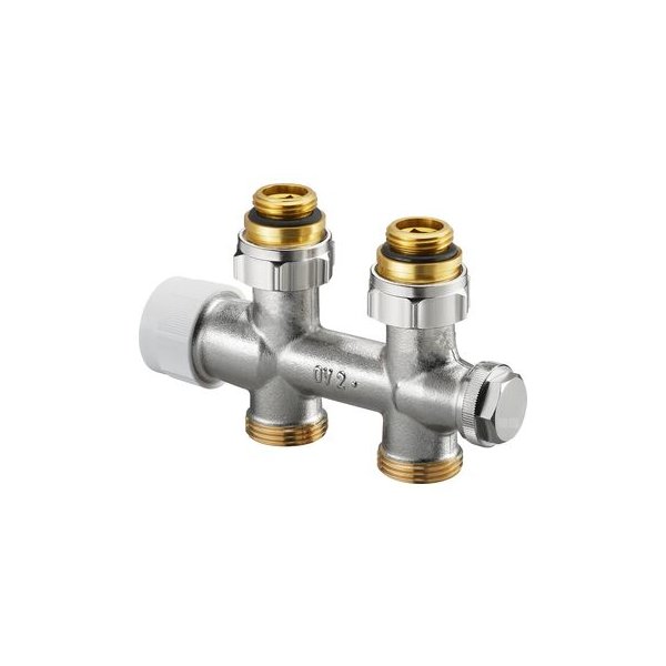 Multiblock T podwójne przyłącze grzejnikowe z nastawą wstępną do 2-rurowej instalacji centralnego ogrzewania PN 10, z funkcjami odcięcia, opróżniania i napełniania, rozstaw osi rur 50 mm. Korpus z mosiądzu, niklowany, trzpień ze stali nierdzewnej z podwójnym uszczelnieniem o-ring. Dowolny kierunek zasilania/powrotu. Do grzejników z króćcami z gwintem zewn. GZ 3/4".