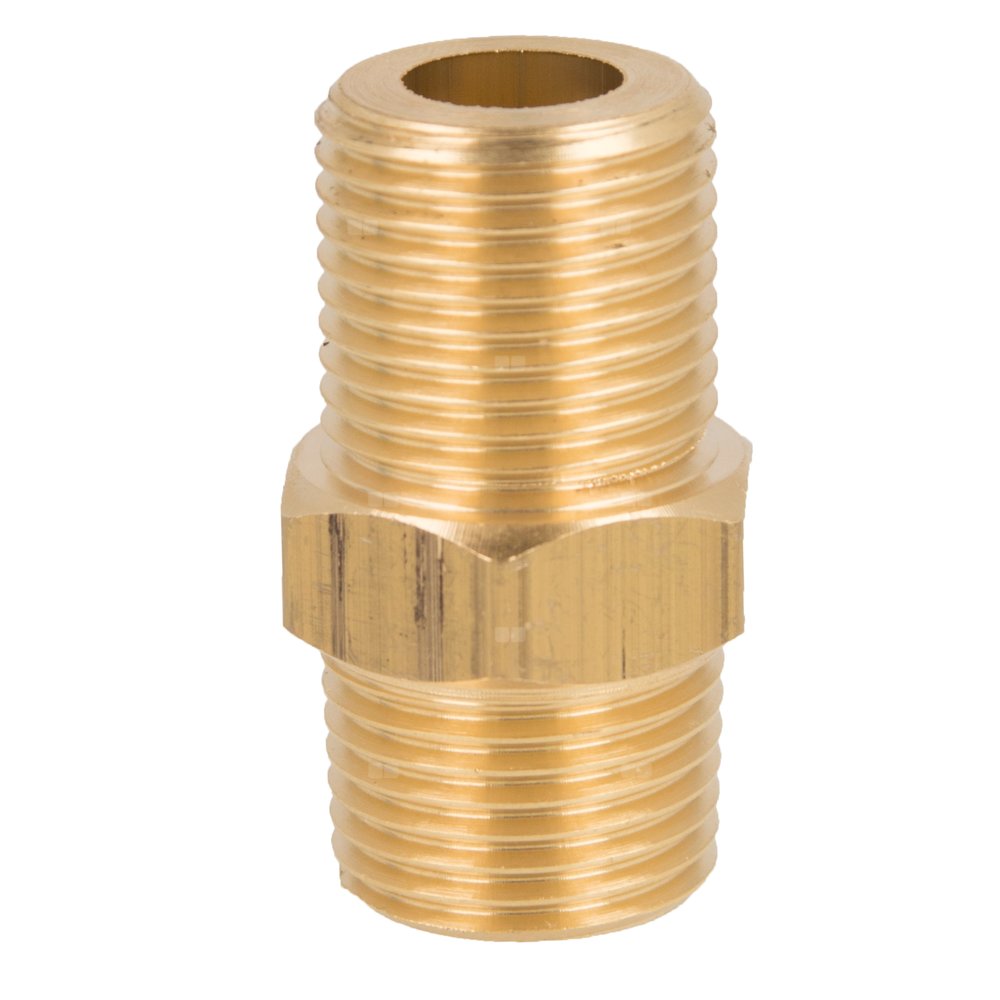 Nypel mosiężny 1/2" do połączenia kurków manometrycznych AMC z dwoma nakrętkami z instalacją.