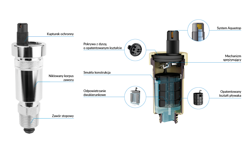 Zawór stopowy umożliwia łatwą wymianę i konserwację odpowietrznika bez konieczności spuszczania medium z instalacji.