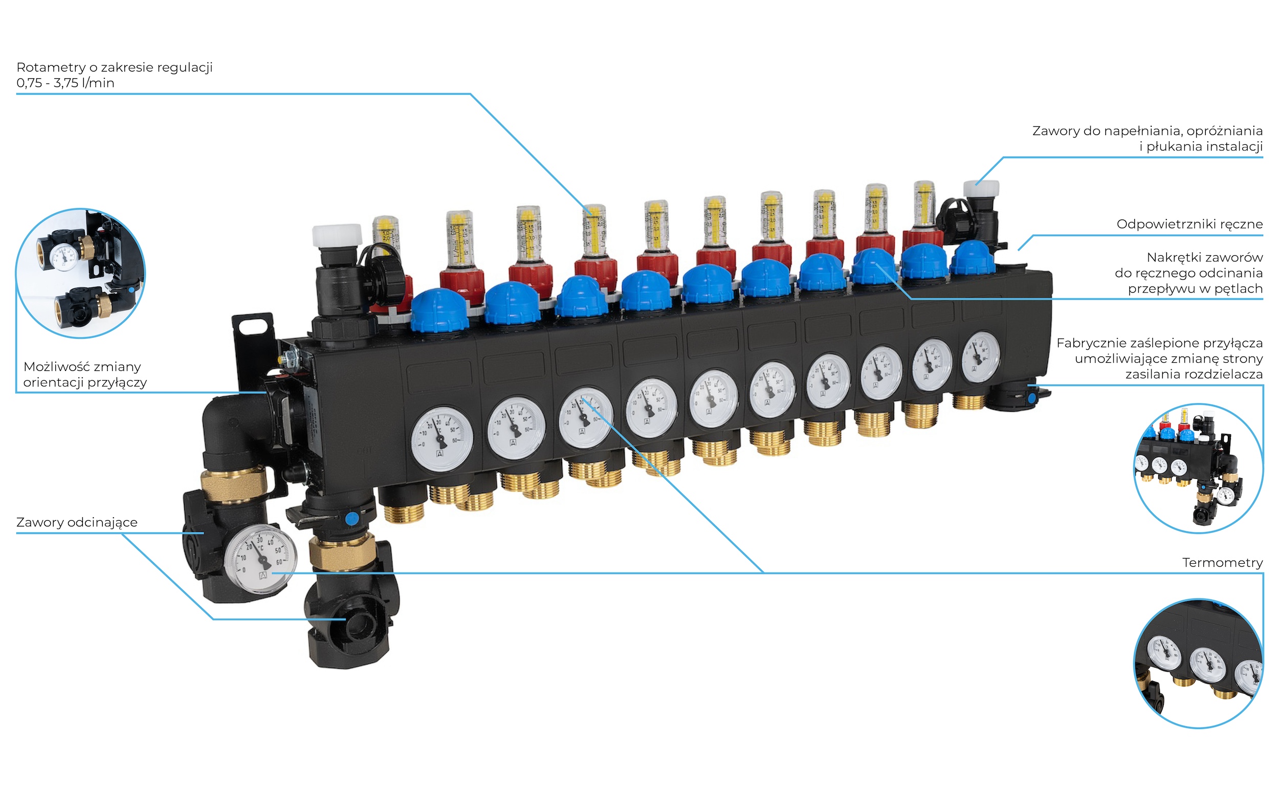 Poliamidowe zawory odcinające ułatwiają pracę konserwacyjne oraz napełnianie oraz płukanie pętli. Zawór na zasilaniu posiada termometr.