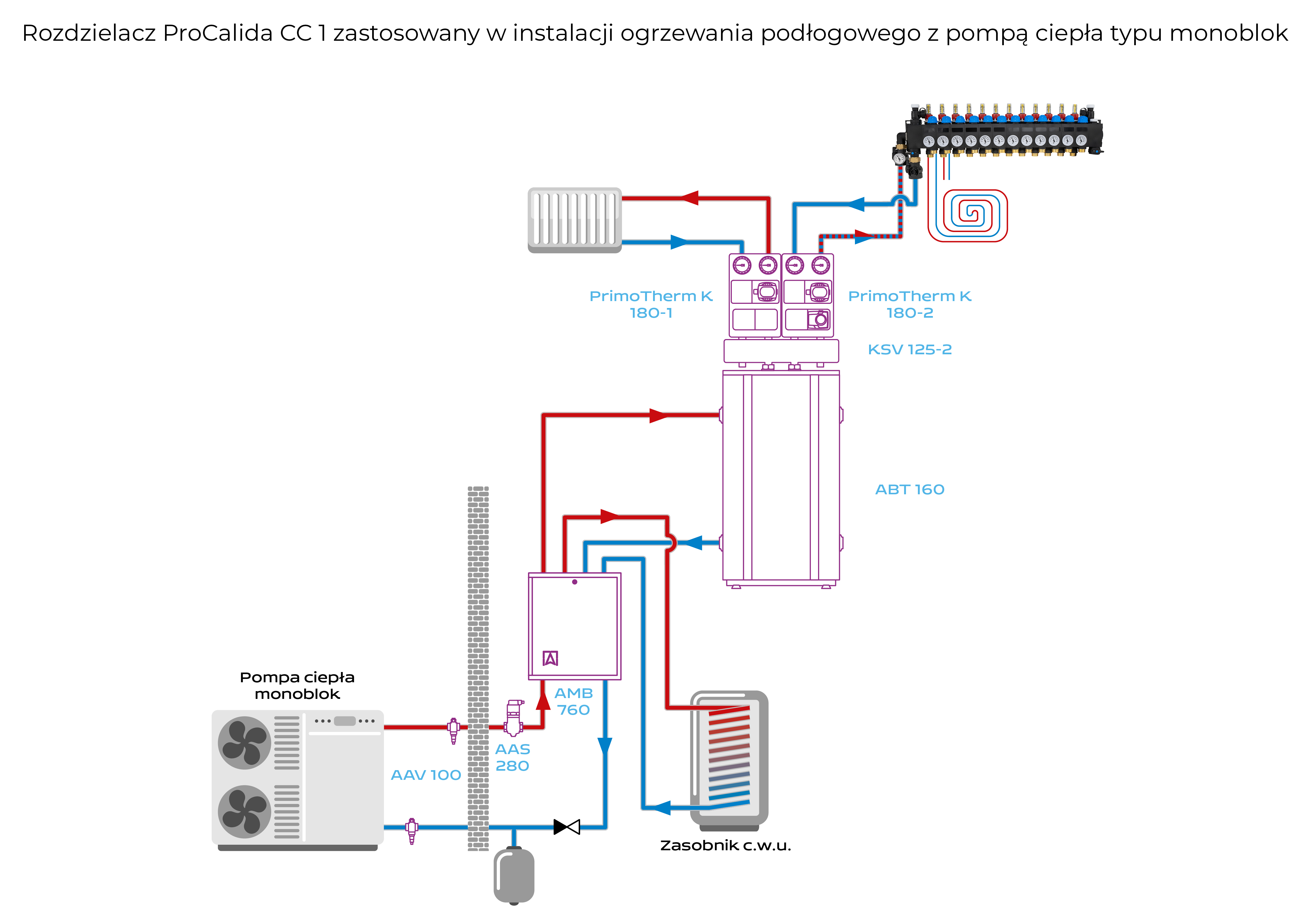Rozprowadza ciepło / chłód ze źródła na poszczególne pętle instalacji płaszczyznowej.