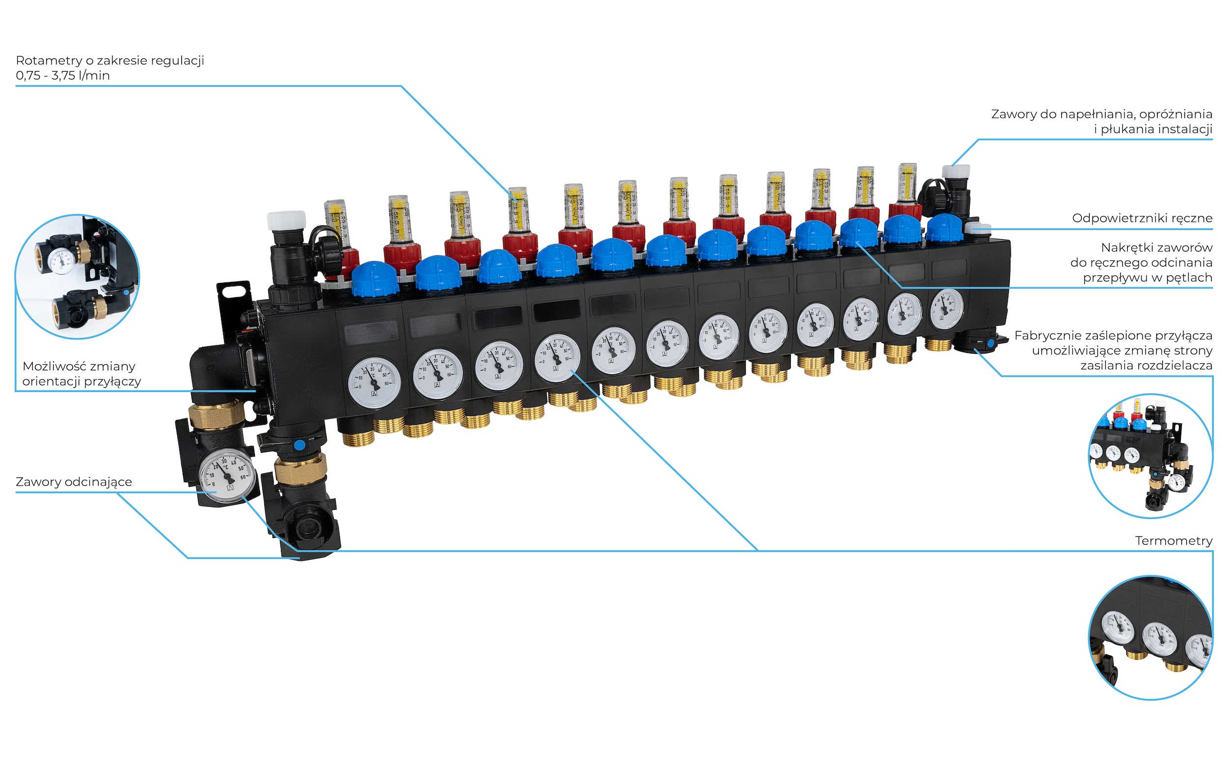 Poliamidowe zawory odcinające ułatwiają pracę konserwacyjne oraz napełnianie oraz płukanie pętli. Zawór na zasilaniu posiada termometr.