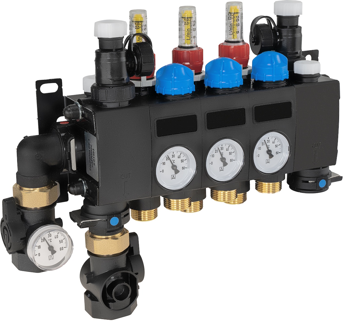 Poliamidowe zawory odcinające ułatwiają pracę konserwacyjne oraz napełnianie oraz płukanie pętli. Zawór na zasilaniu posiada termometr.