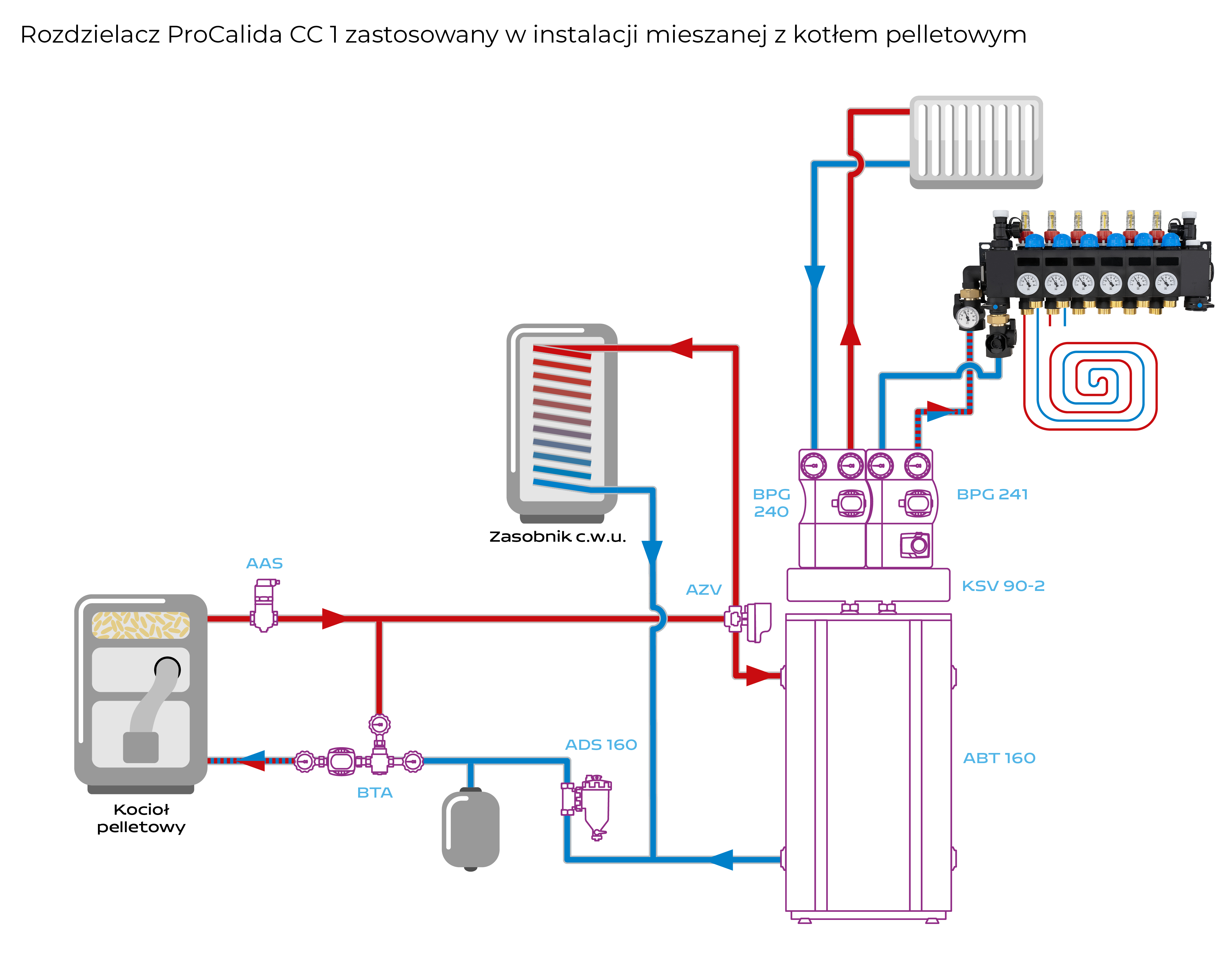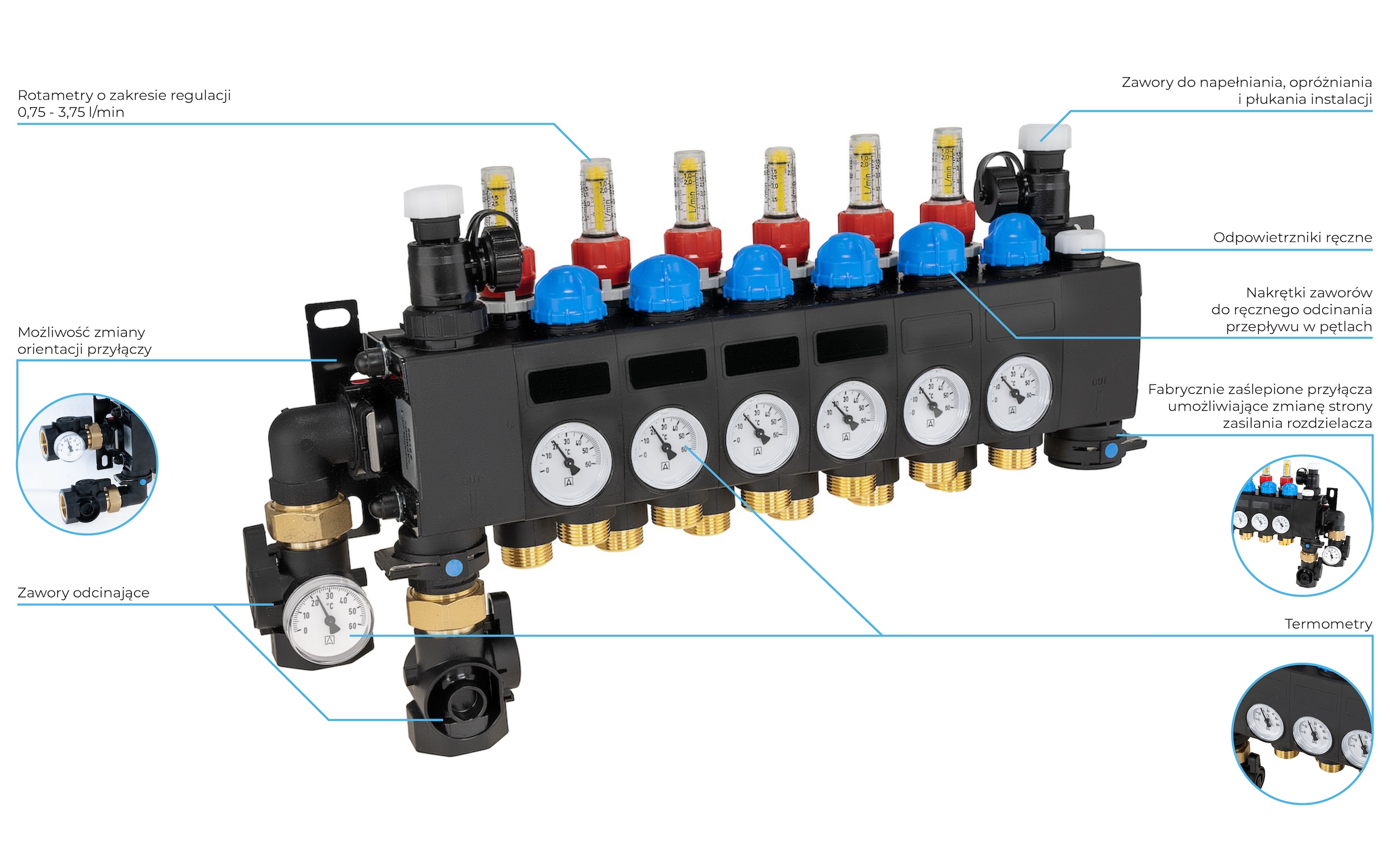 Rozprowadza ciepło / chłód ze źródła na poszczególne pętle instalacji płaszczyznowej.
