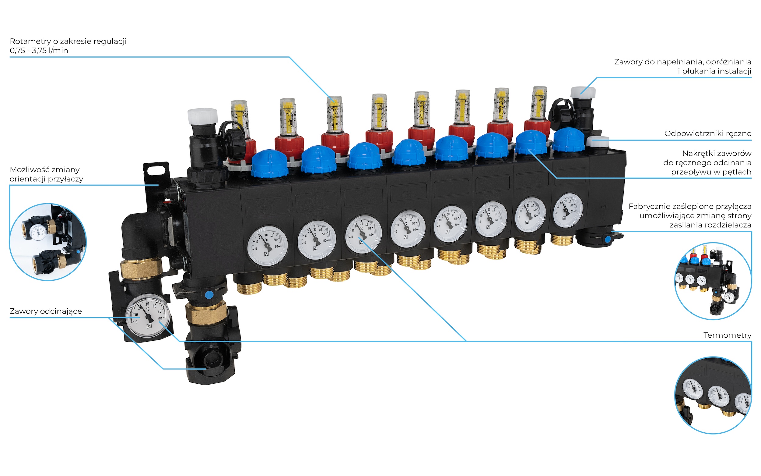 Poliamidowe zawory odcinające ułatwiają pracę konserwacyjne oraz napełnianie oraz płukanie pętli. Zawór na zasilaniu posiada termometr.