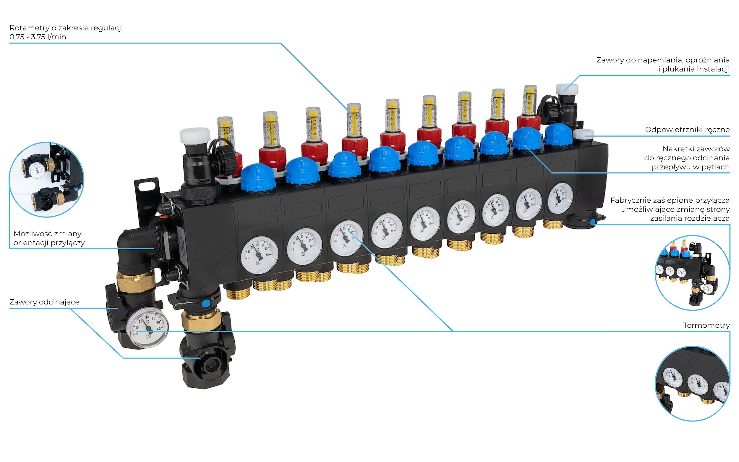 Poliamidowe zawory odcinające ułatwiają pracę konserwacyjne oraz napełnianie oraz płukanie pętli. Zawór na zasilaniu posiada termometr.