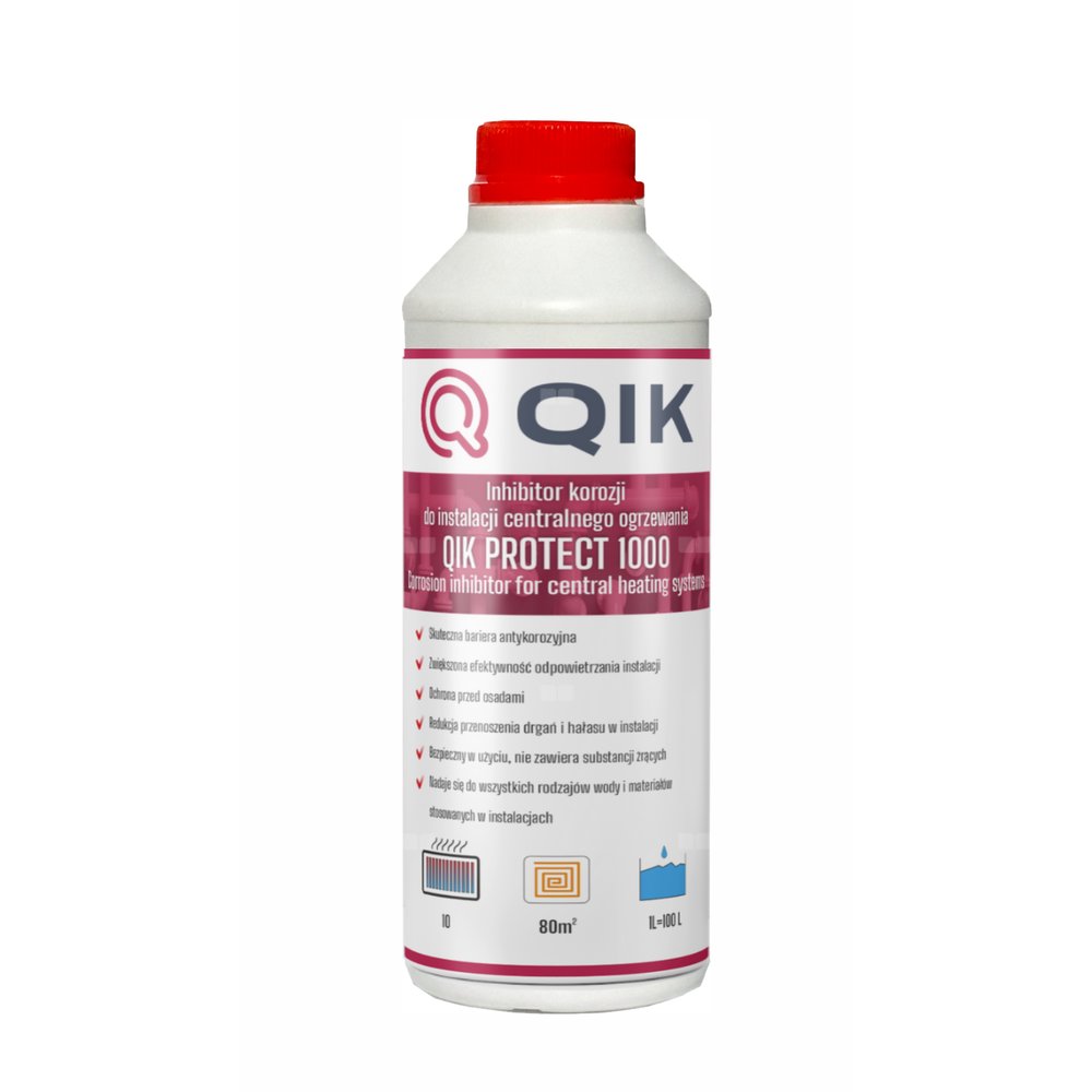 Inhibitor korozji QIK PROTECT 1000 to profesjonalny środek do zapobiegania korozji metali, tworzeniu się kamienia, hałasu i gazu w instalacji wszystkich typach systemów centralnego ogrzewania.