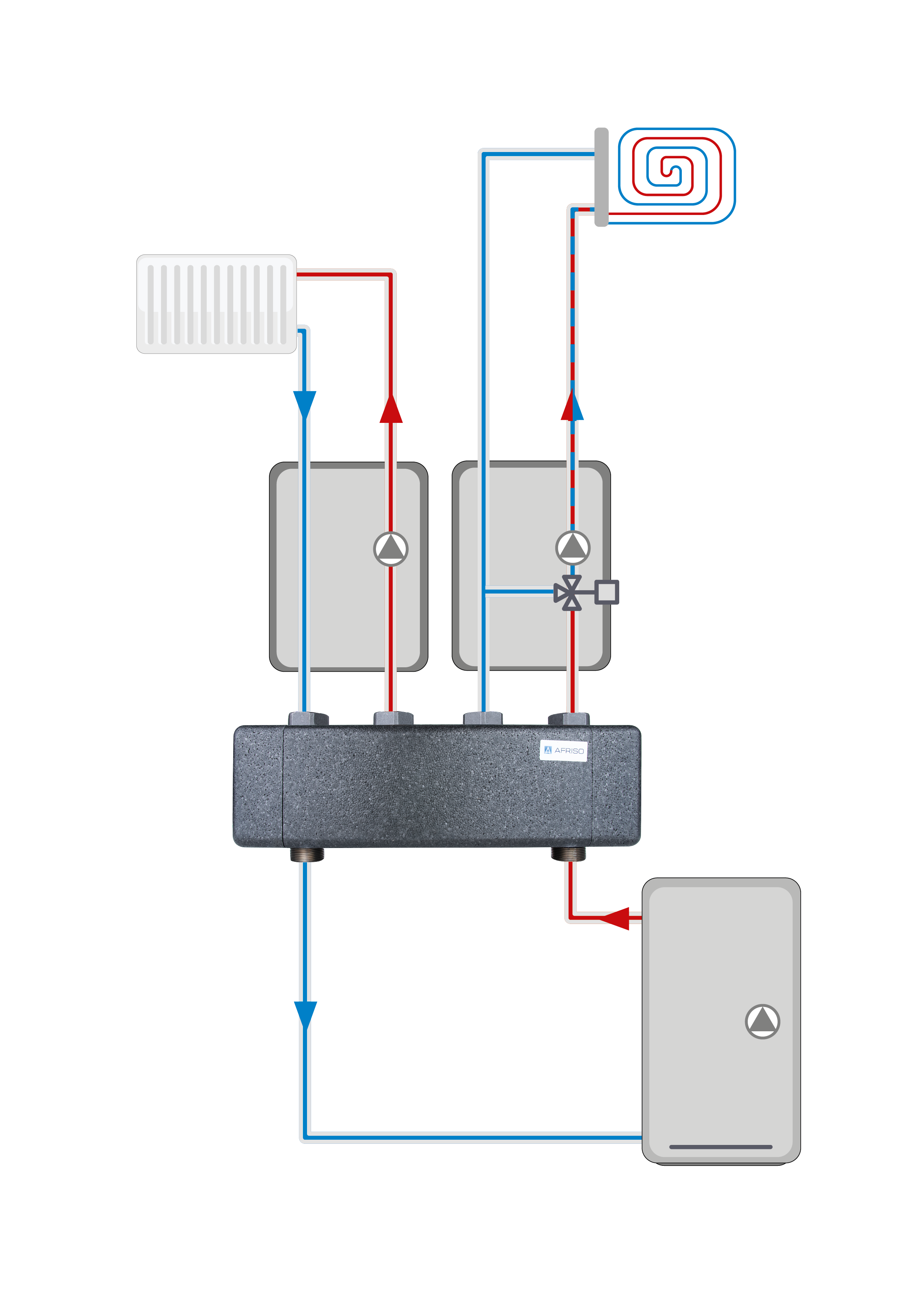 Stosowany w instalacjach grzewczych i chłodzących.Montowany na ścianie pomiędzy źródłem ciepła lub chłodu a grupami pompowymi.