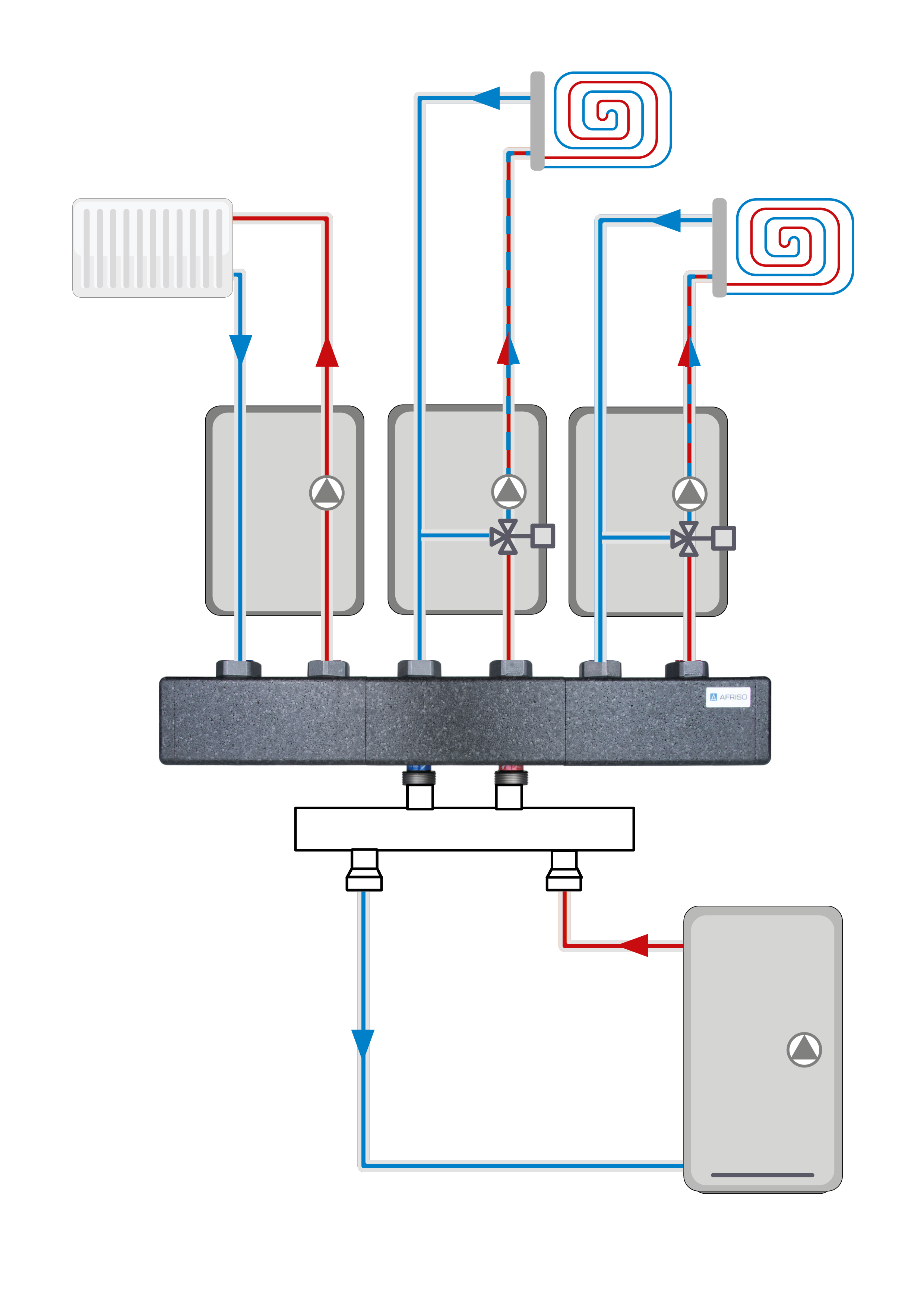Przeznaczony do szybkiego i wygodnego podłączenia trzech grup pompowych PrimoTherm do źródła ciepła.