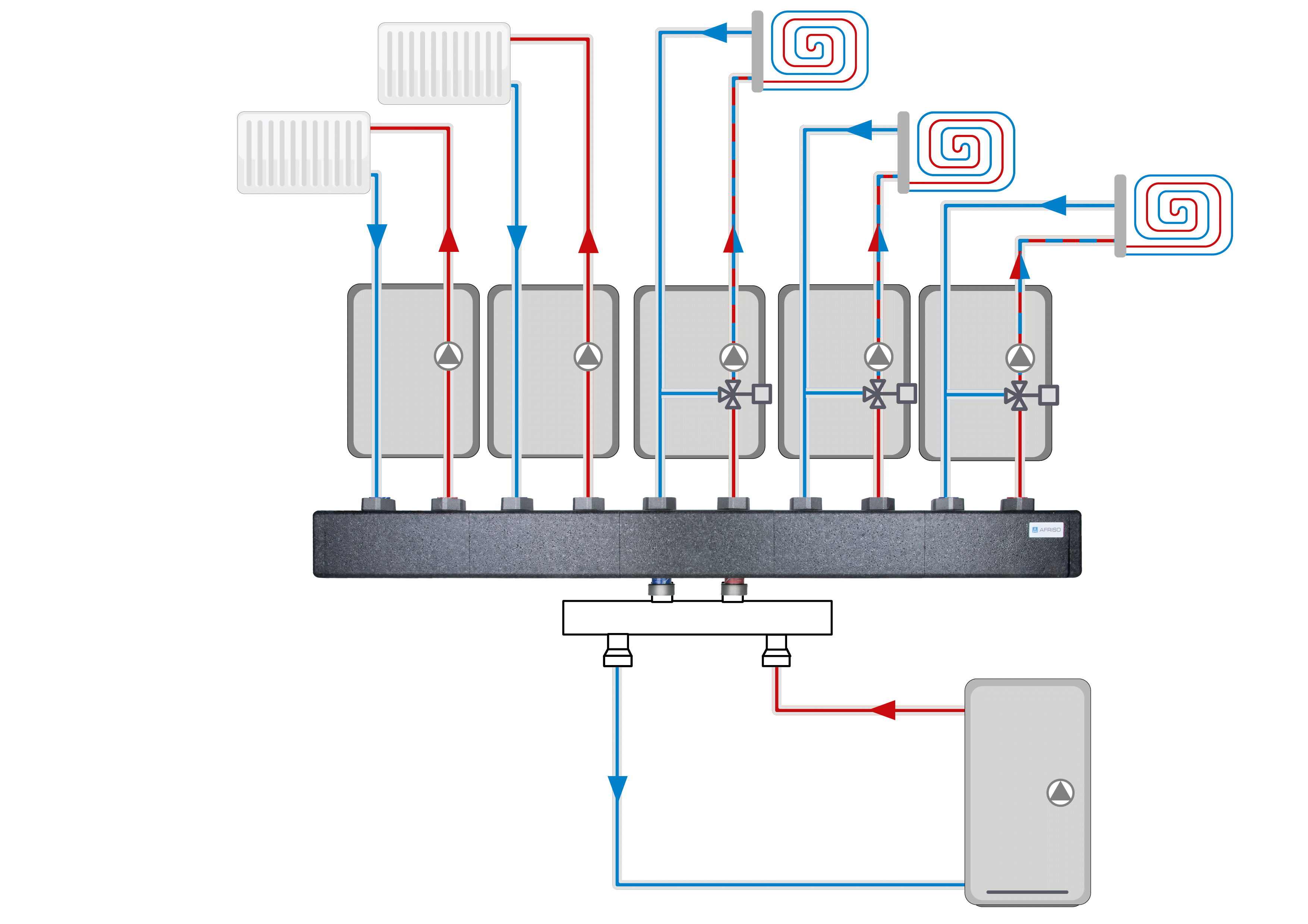 Przeznaczony do szybkiego i wygodnego podłączenia pięciu grup pompowych PrimoTherm do źródła ciepła.