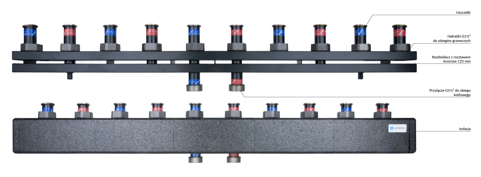 Rozdzielacz do instalacji c.o. AFRISO KSV 125-5 GZ 1 1/2'', 5-obieg. Nakrętka 1 1/2'', max. 70 kW