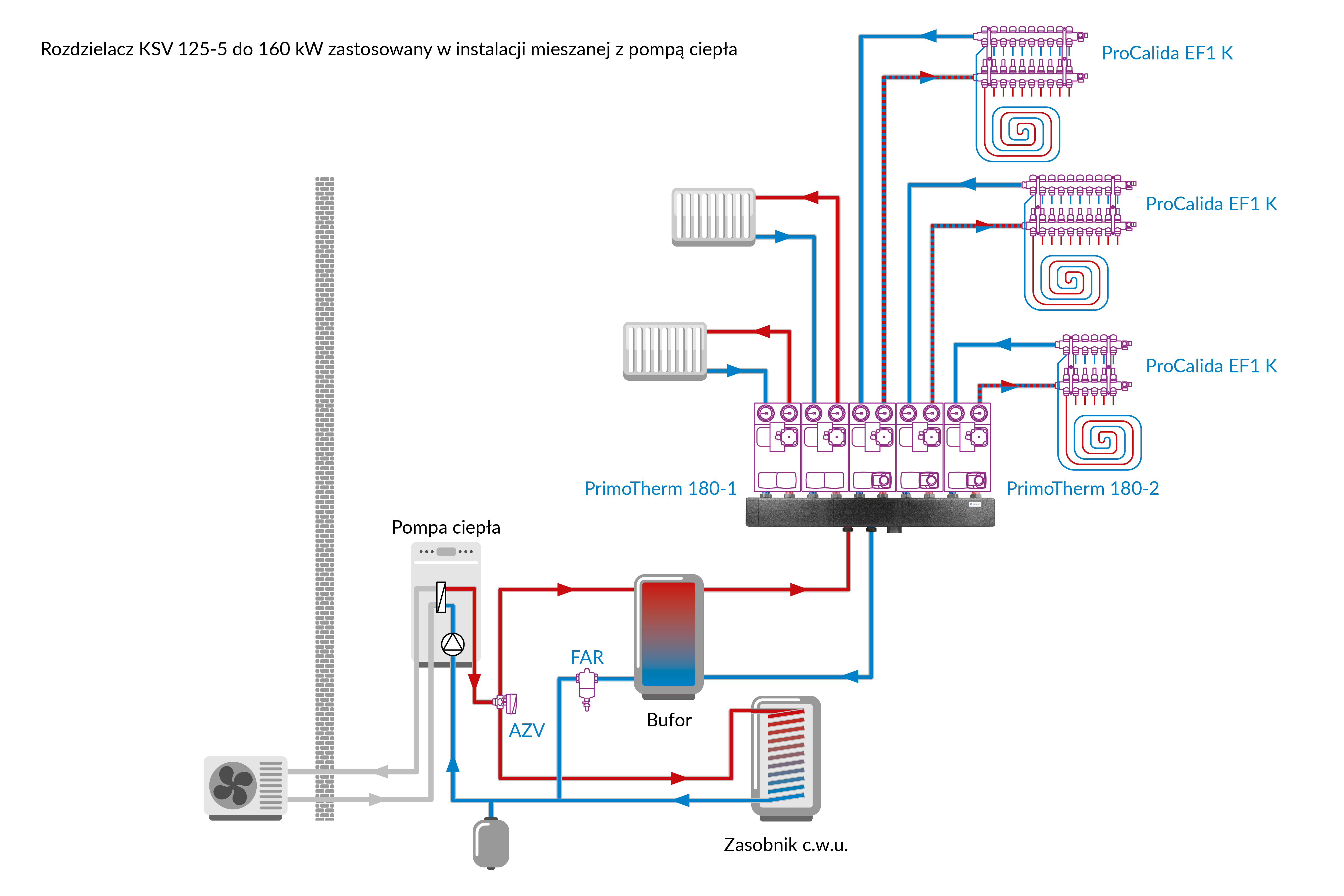 Stosowany w instalacjach grzewczych i chłodzących.Montowany na ścianie pomiędzy źródłem ciepła lub chłodu a grupami pompowymi.