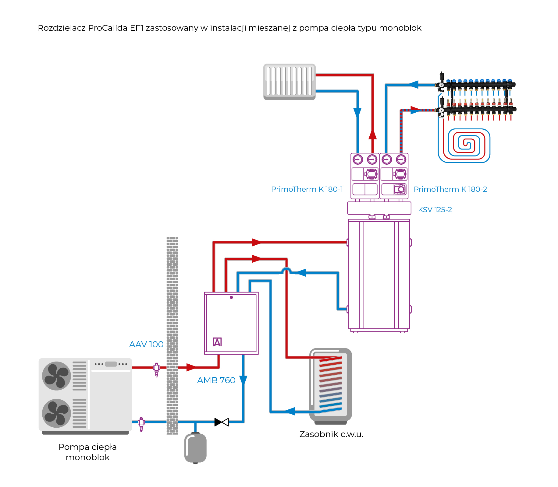 Rozprowadza ciepło/chłód ze źródła na poszczególne pętle instalacji płaszczyznowej.