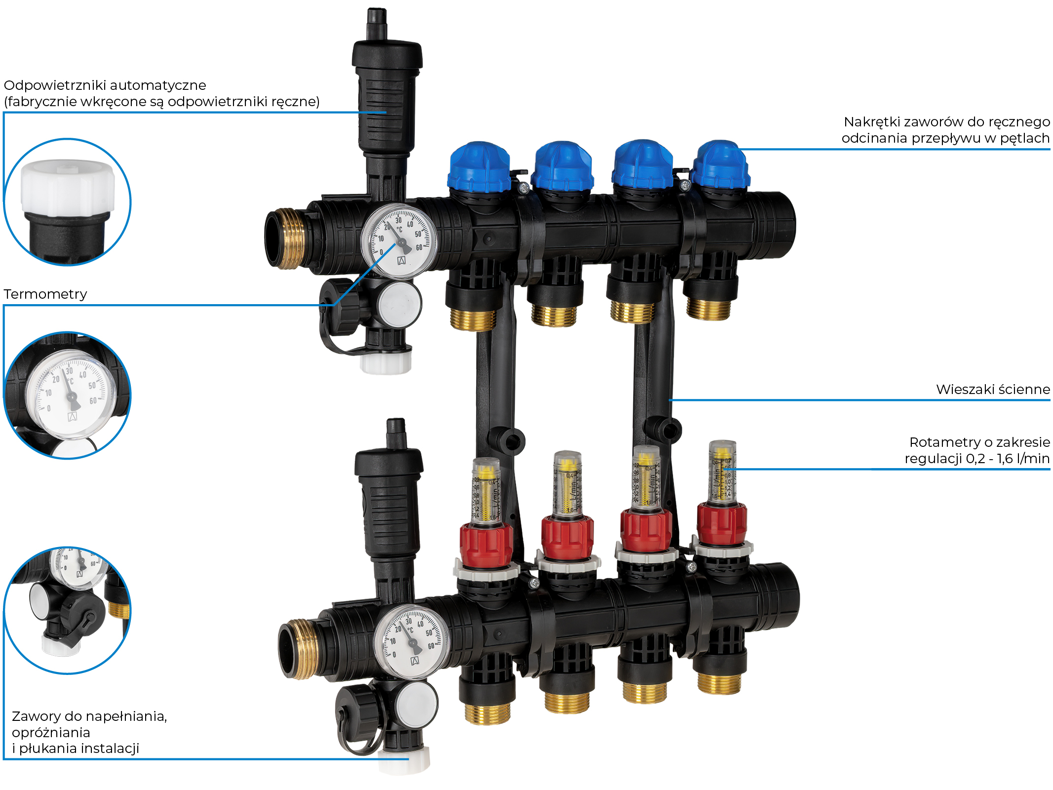 Rozprowadza ciepło/chłód ze źródła na poszczególne pętle instalacji płaszczyznowej.