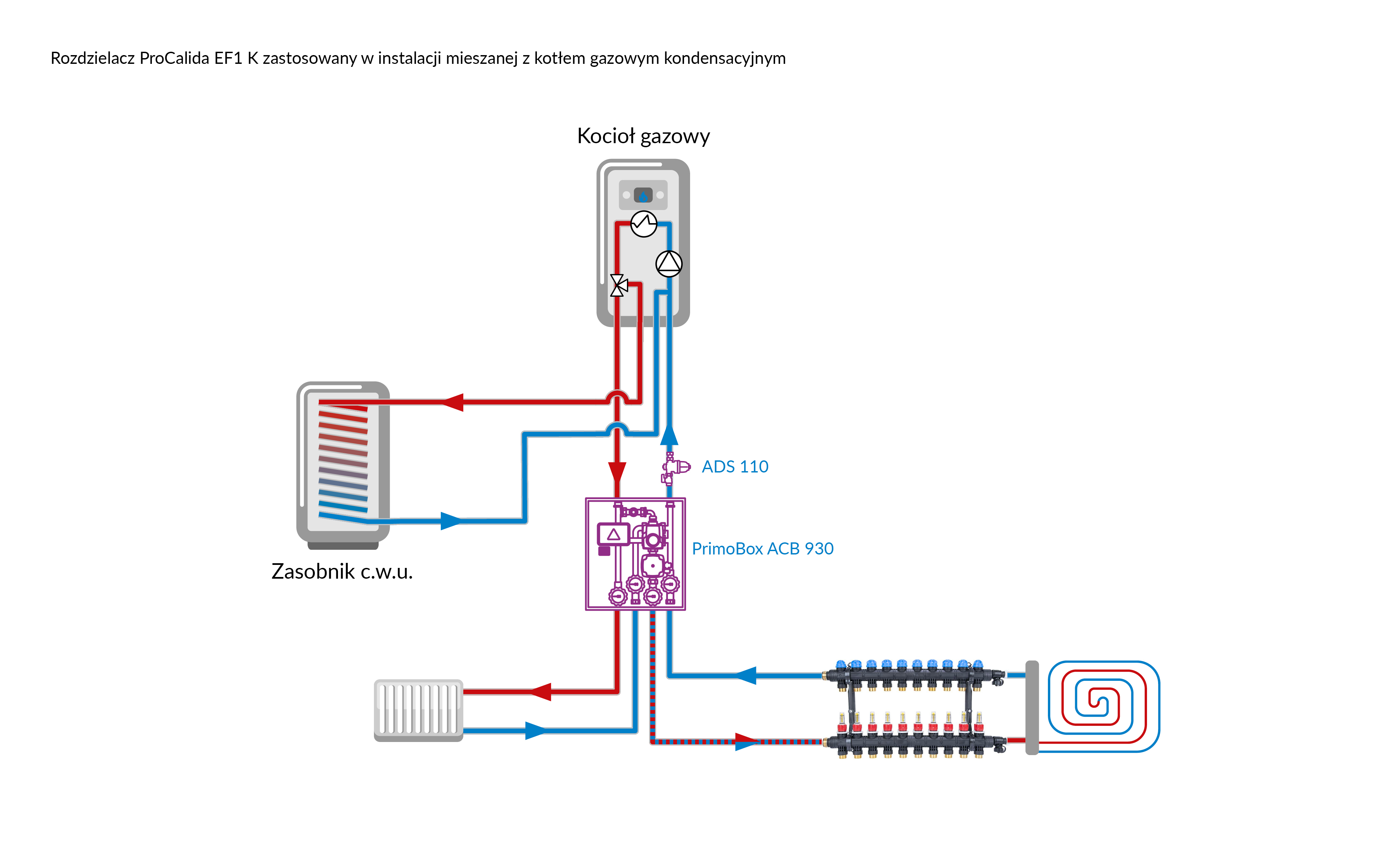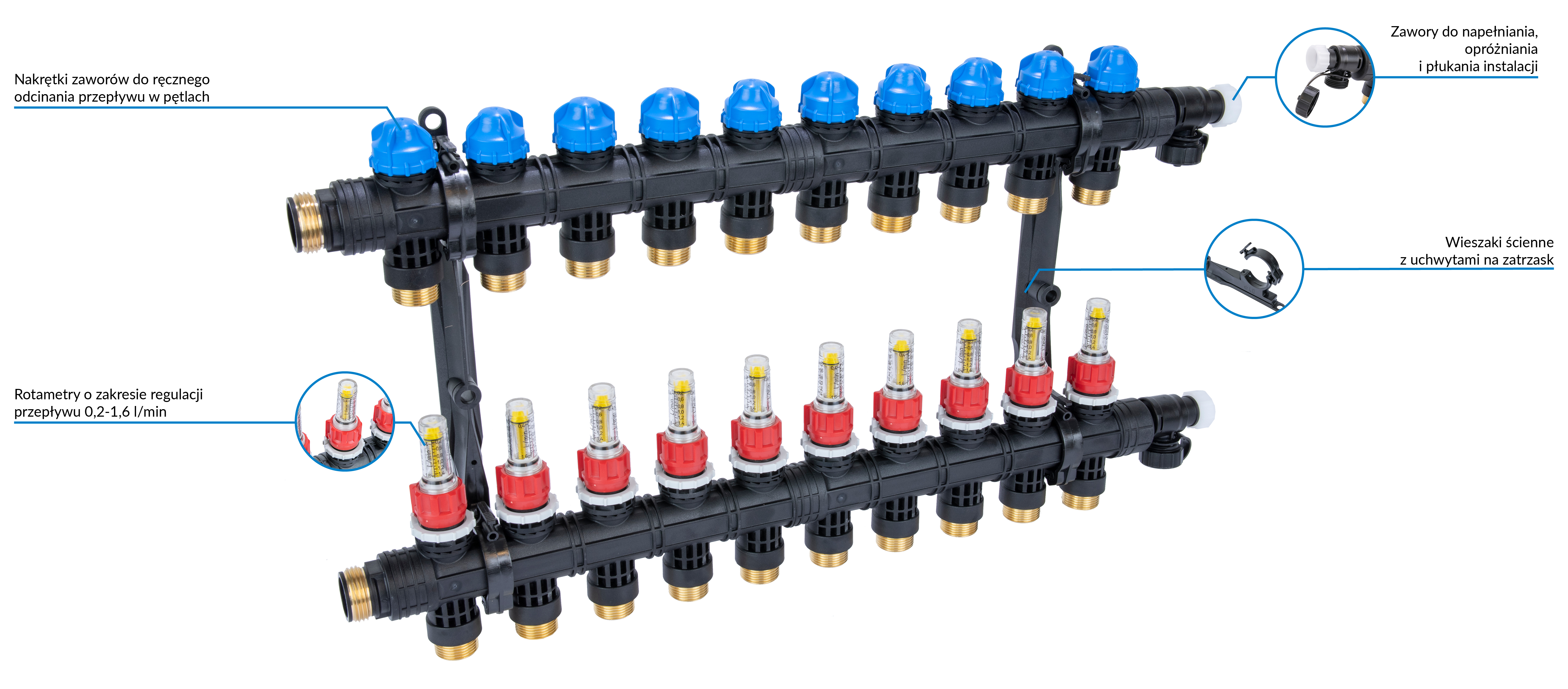 Rozprowadza ciepło / chłód ze źródła na poszczególne pętle instalacji płaszczyznowej.