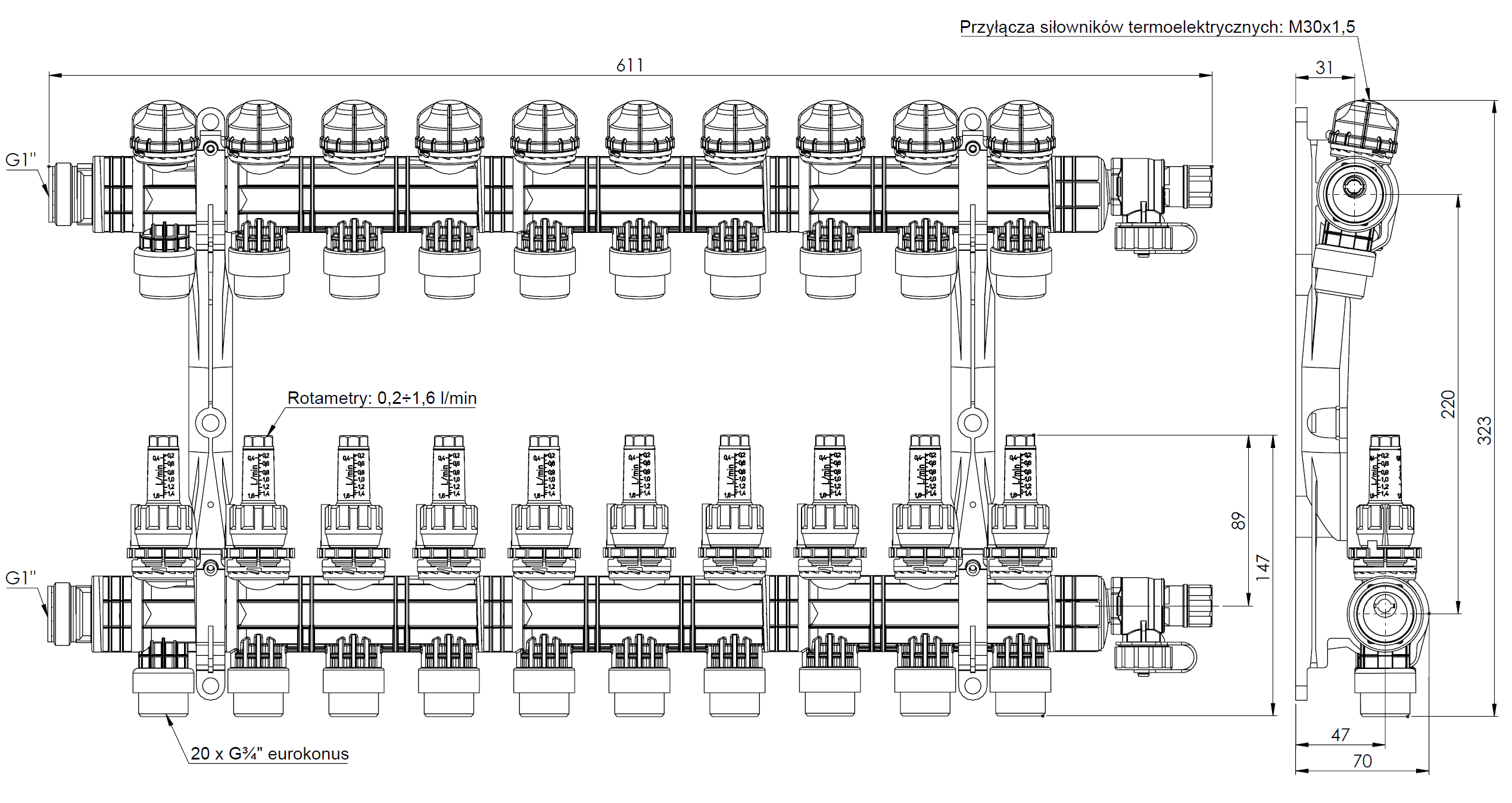 Rozdzielacz do ogrzewania podłogowego AFRISO ProCalida EF1 K 10-obieg. poliamid GZ 1'' x euroconus 3/4'' + przepływomierz + zawór napełn/spust