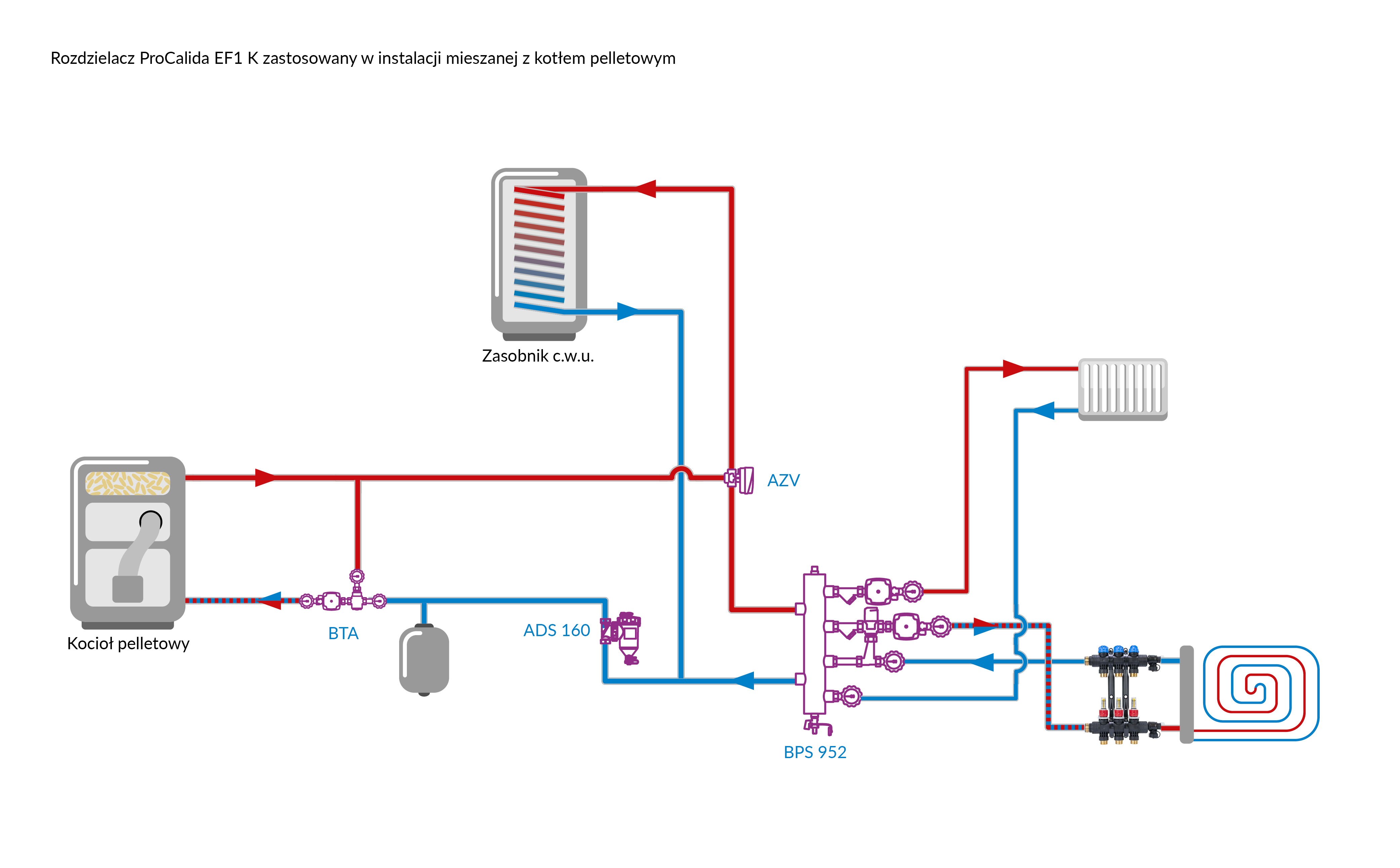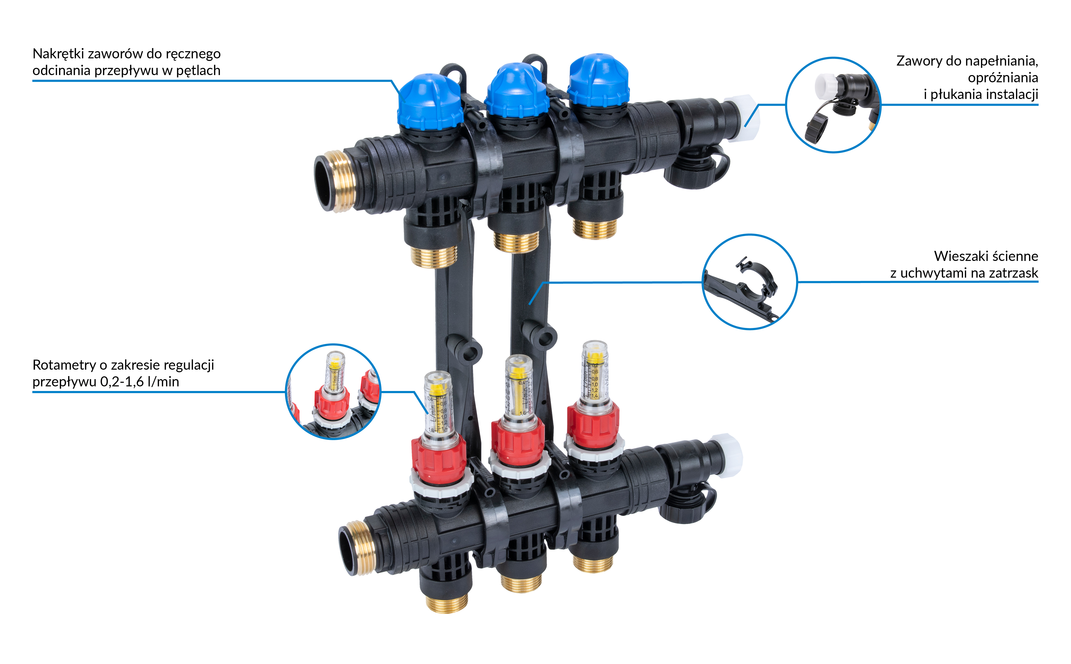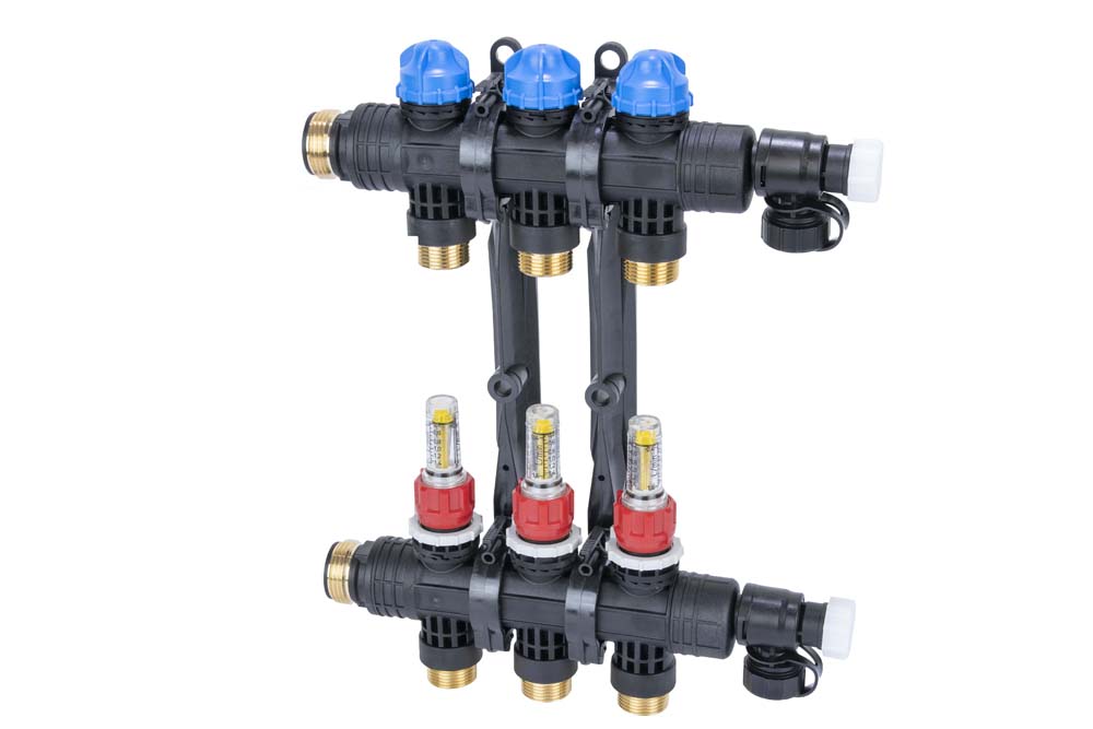 Rozprowadza ciepło / chłód ze źródła na poszczególne pętle instalacji płaszczyznowej.