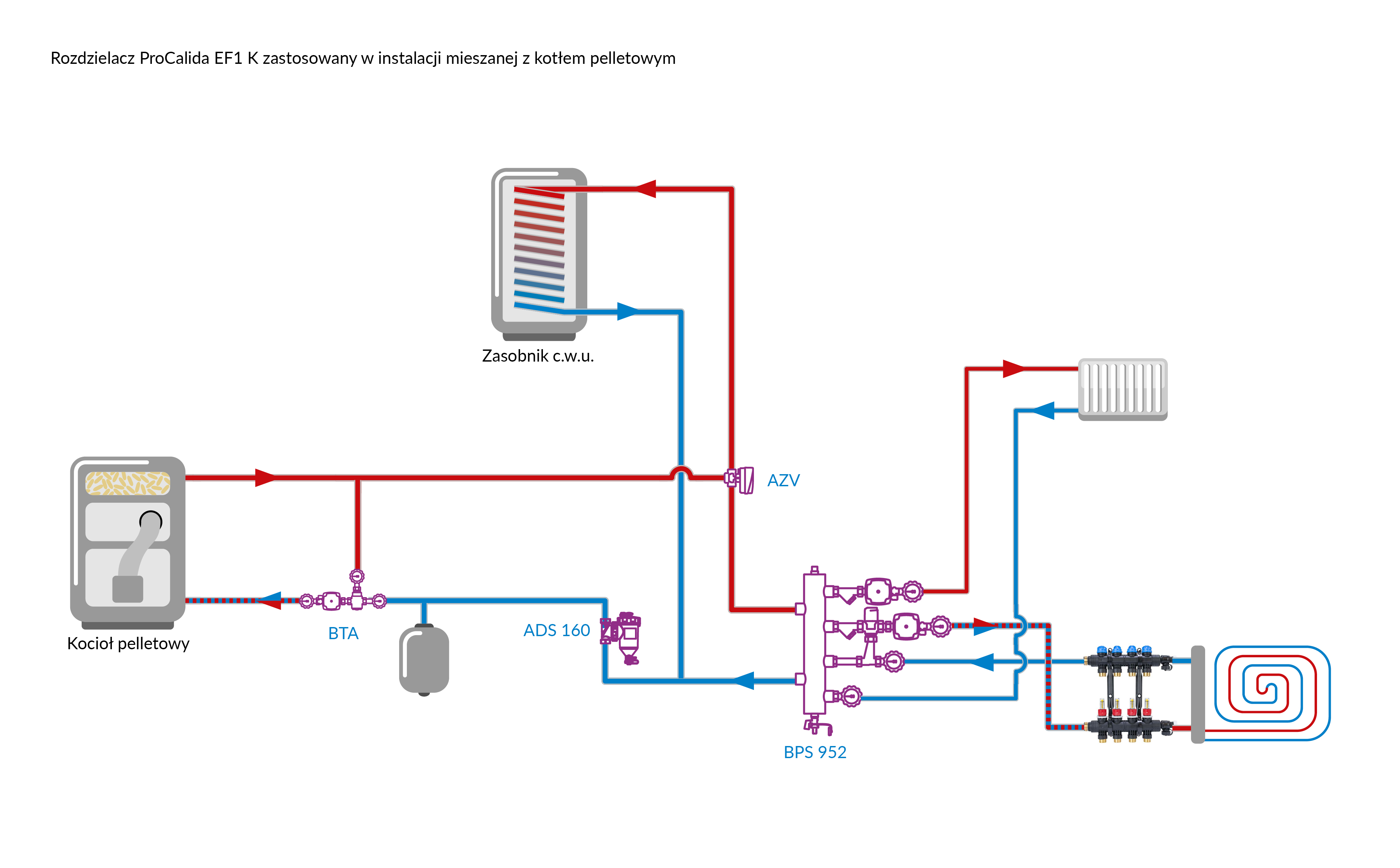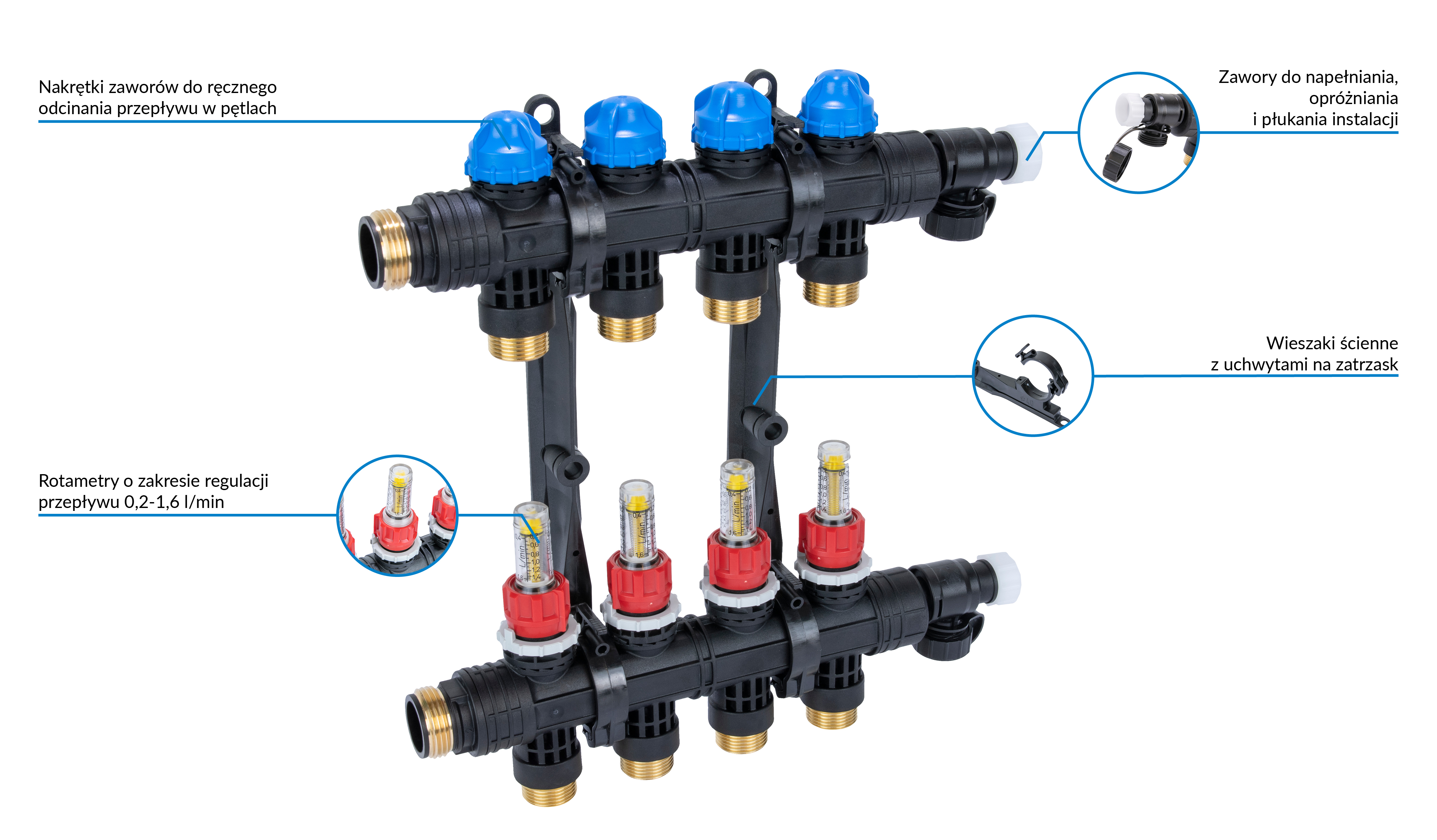 Rozprowadza ciepło / chłód ze źródła na poszczególne pętle instalacji płaszczyznowej.