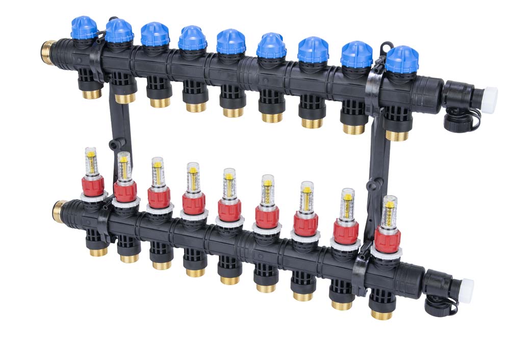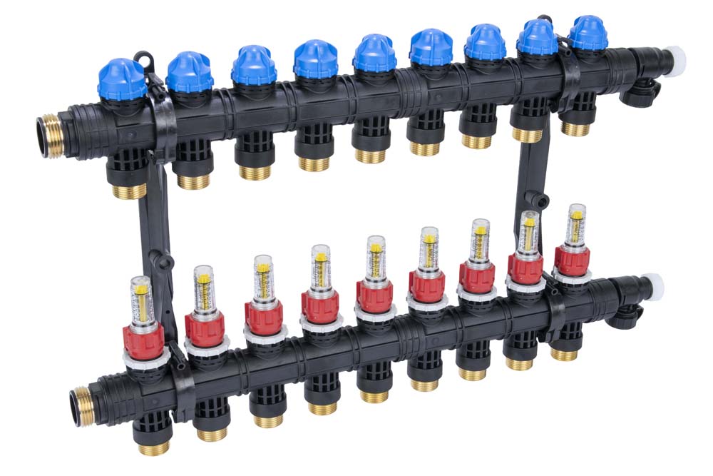 Rozdzielacz do ogrzewania podłogowego AFRISO ProCalida EF1 K 9-obieg. poliamid GZ 1'' x euroconus 3/4'' + przepływomierz + zawór napełn/spust