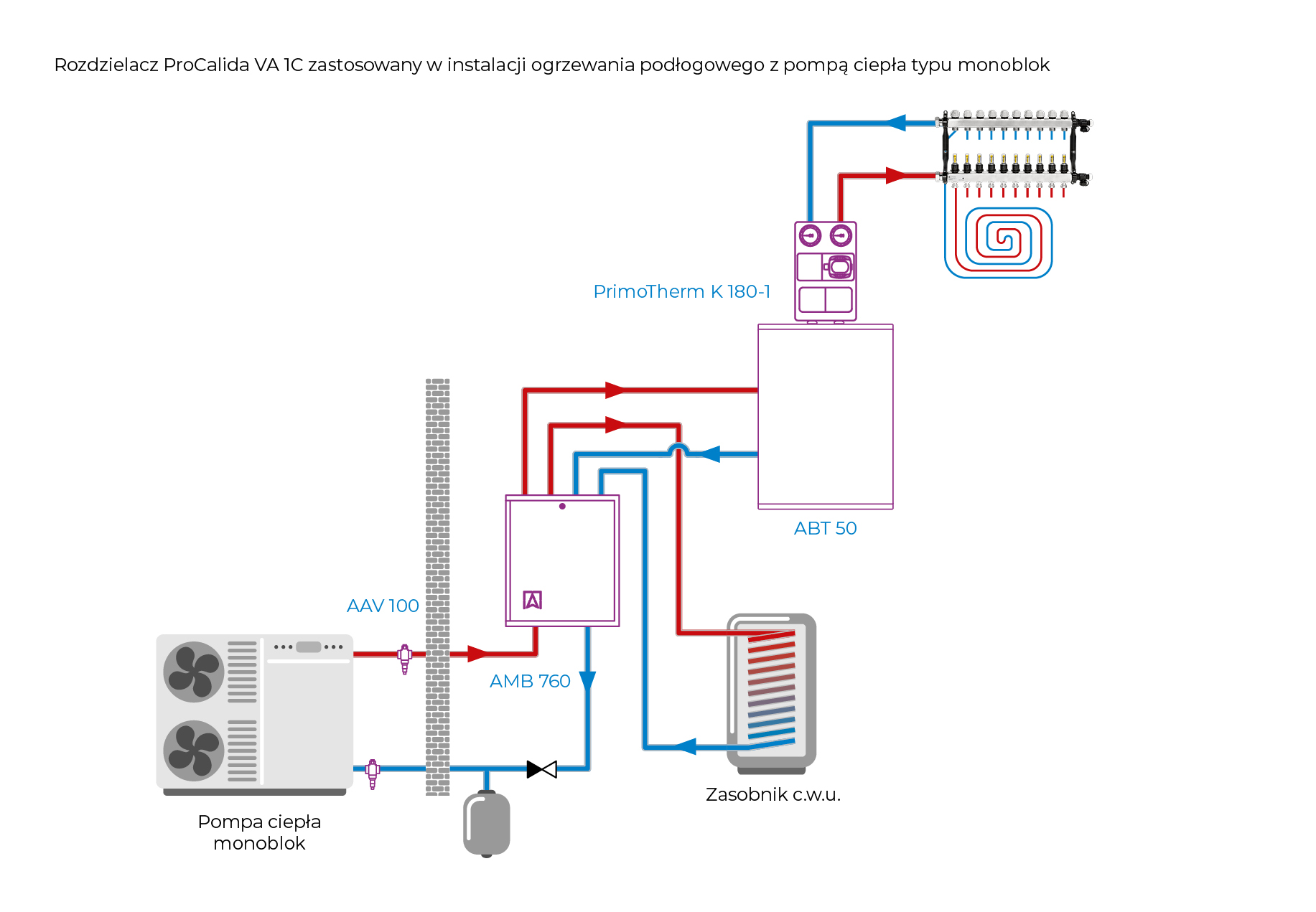 Rozprowadza ciepło/chłód ze źródła na poszczególne pętle instalacji płaszczyznowej.