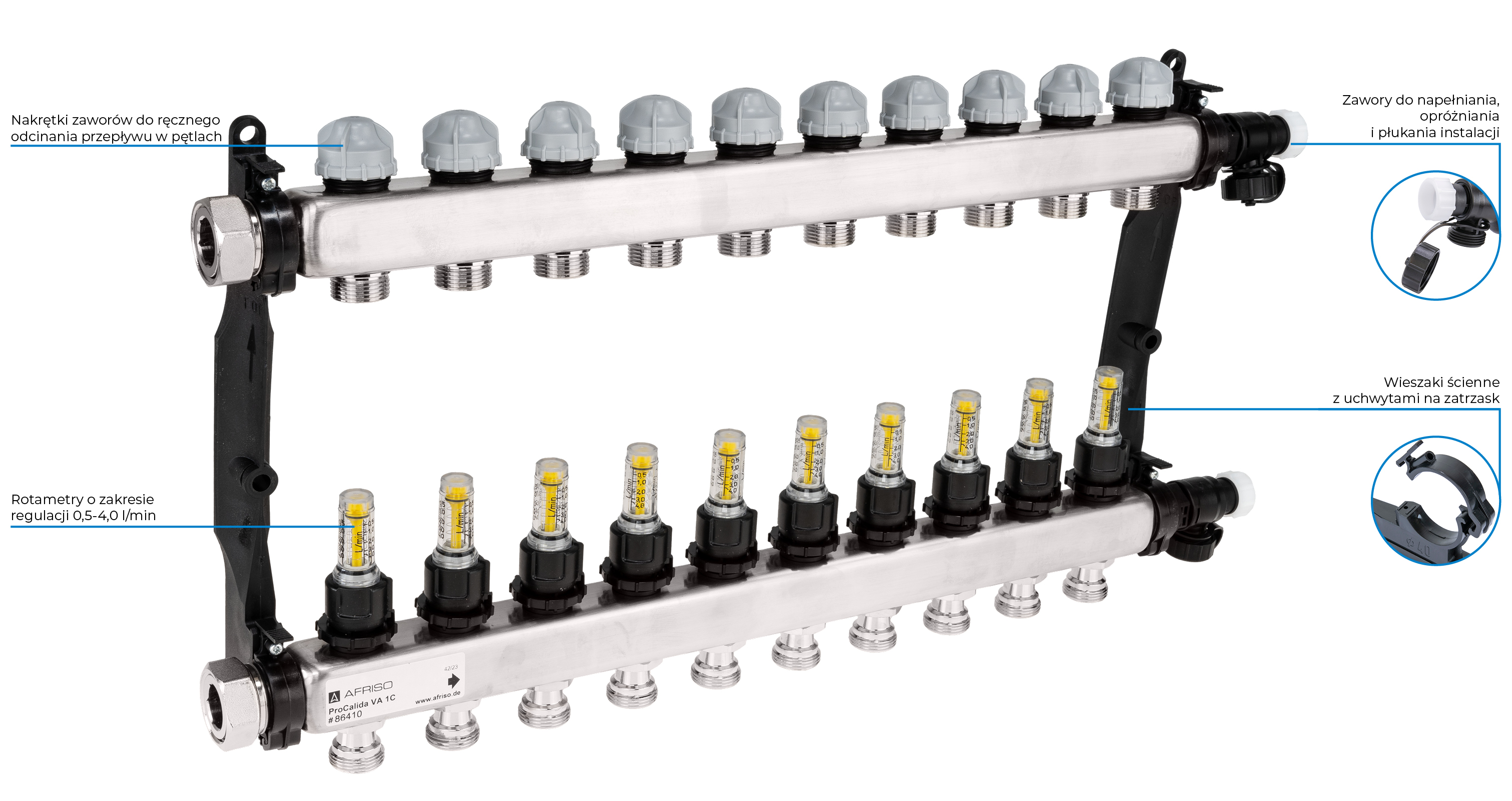 Rozdzielacz do ogrzewania podłogowego AFRISO ProCalida VA 1C 10-obieg. stal nierdzewna GZ 1'' x euroconus 3/4''