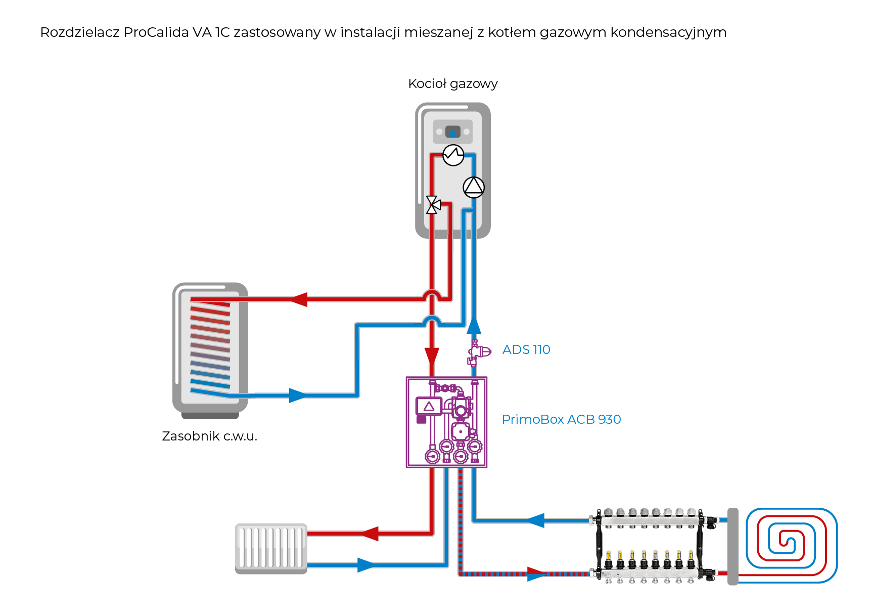 Rozprowadza ciepło/chłód ze źródła na poszczególne pętle instalacji płaszczyznowej.