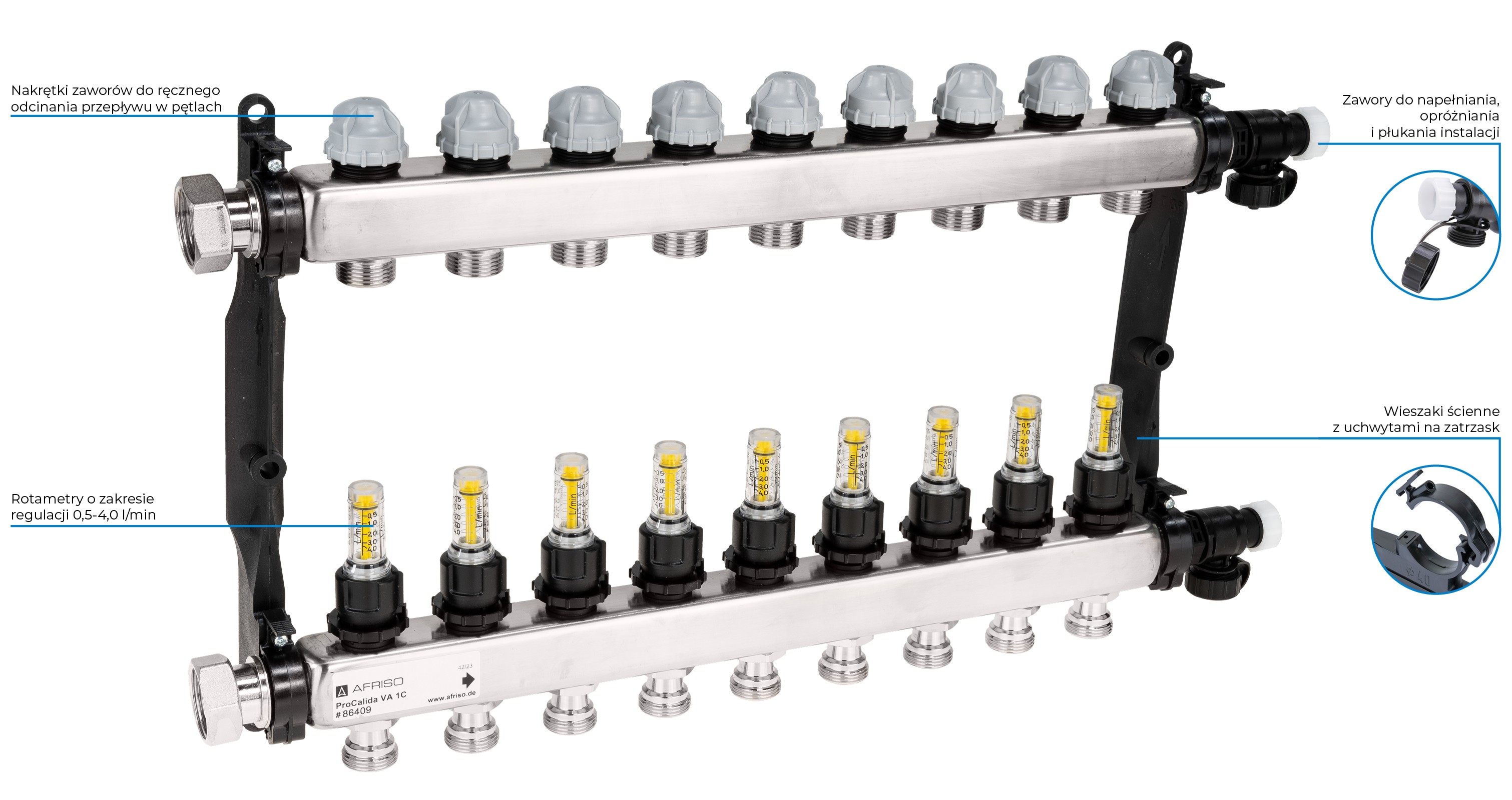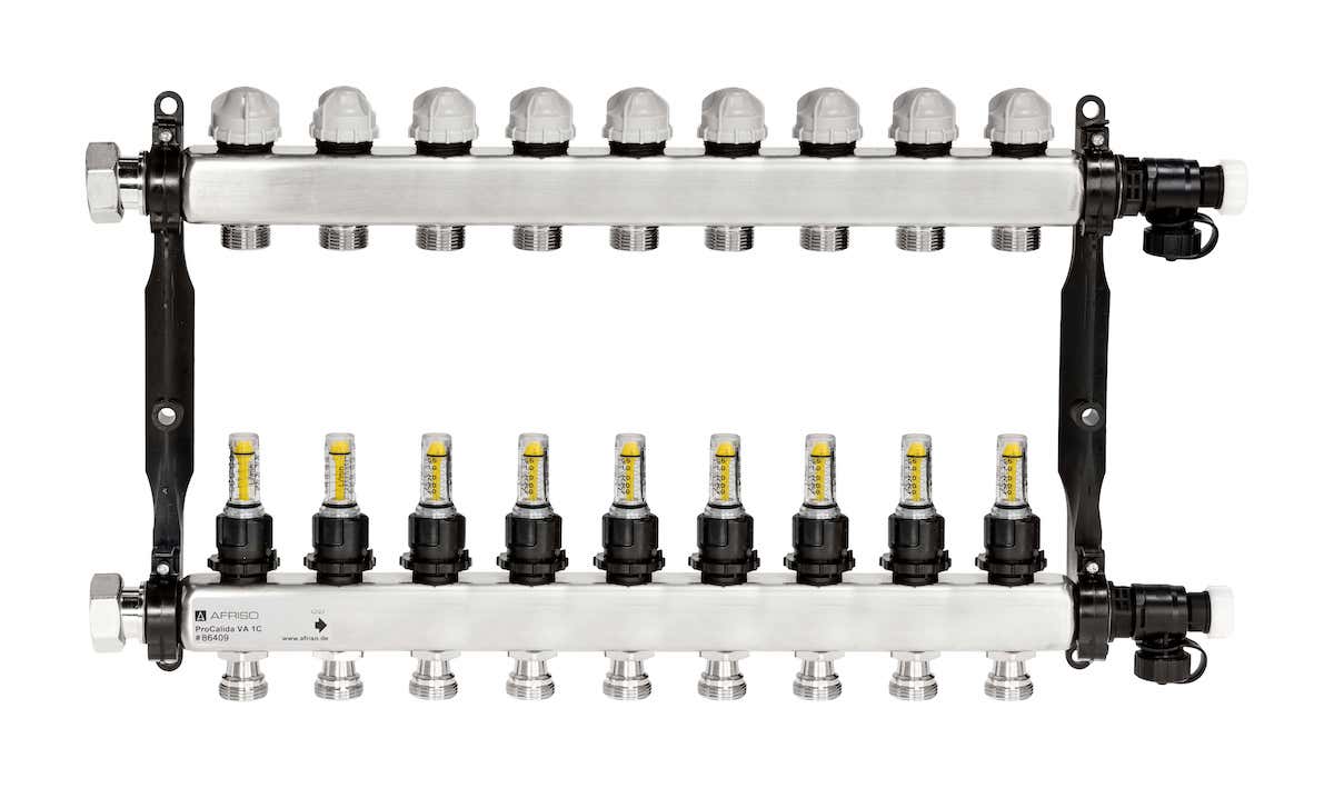 Rozdzielacz do ogrzewania podłogowego AFRISO ProCalida VA 1C 9-obieg. stal nierdzewna GZ 1'' x euroconus 3/4''