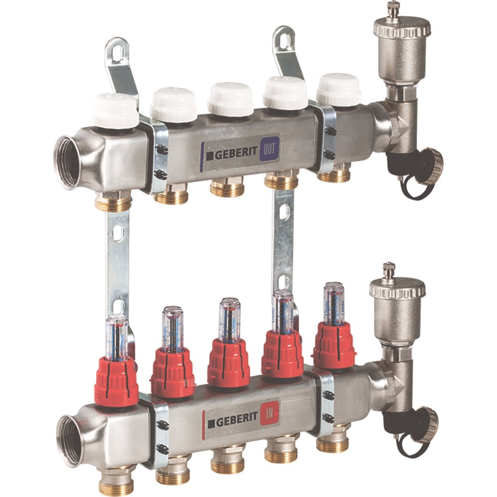 Rozdzielacz do ogrzewania podłogowego GEBERIT Volex 4-obieg. stal nierdzewna GW 1'' x eurokonus 3/4'' + przepływomierz + zawór napełn/spust + odpowietrznik