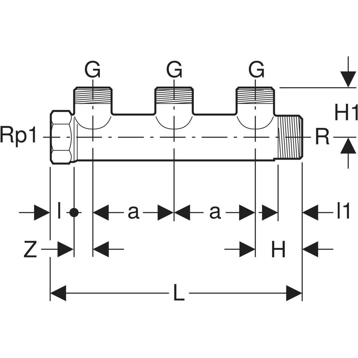 Rozdzielacz hydrauliczny GEBERIT Mepla R mosiądz GW gazowy walcowy x GZ gazowy walcowy 3/4'', odgałęzień: 3 (3/4'')