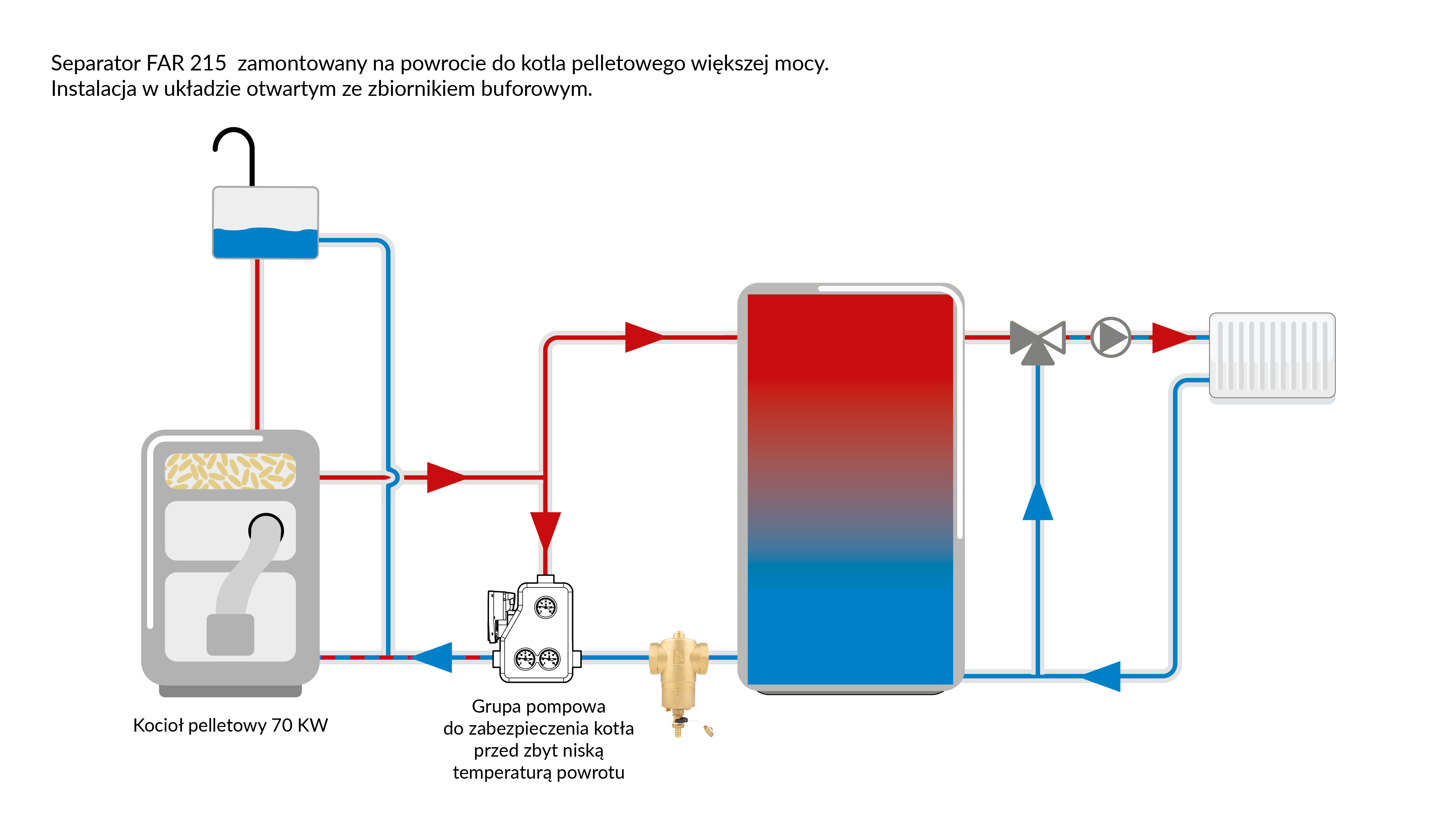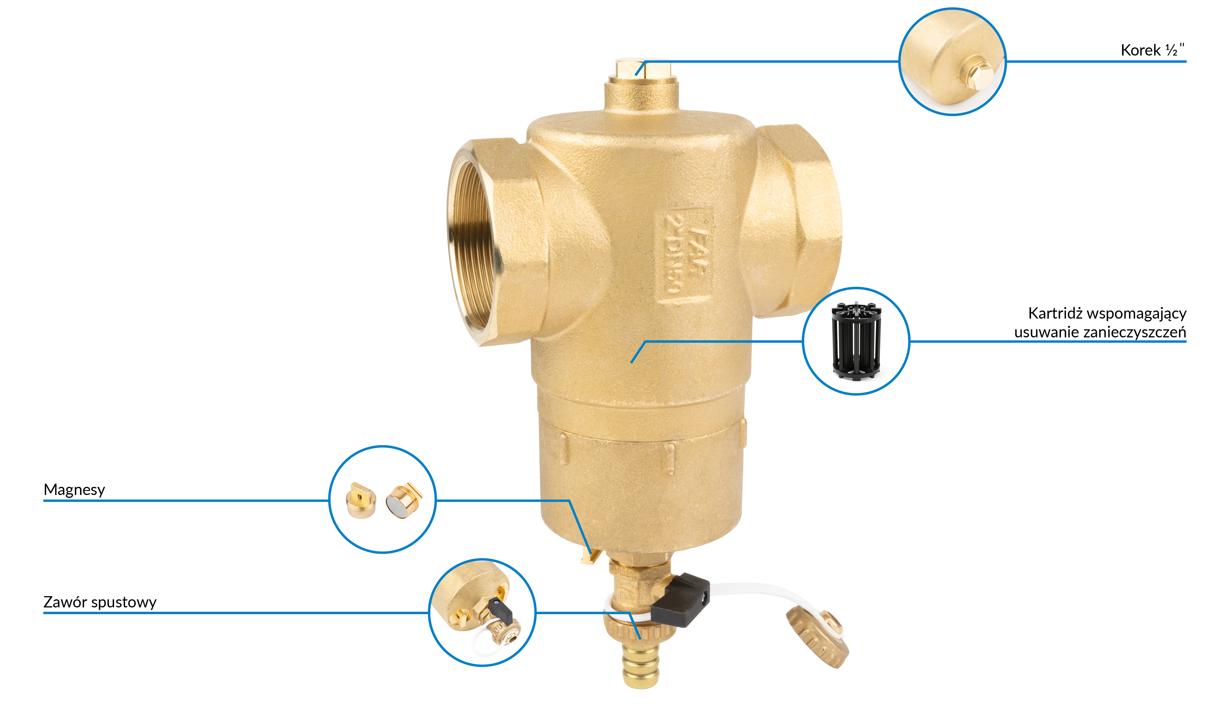 - Stosowany w instalacjach grzewczych i chłodzących.- Montowany na powrocie z instalacji przed źródłem.