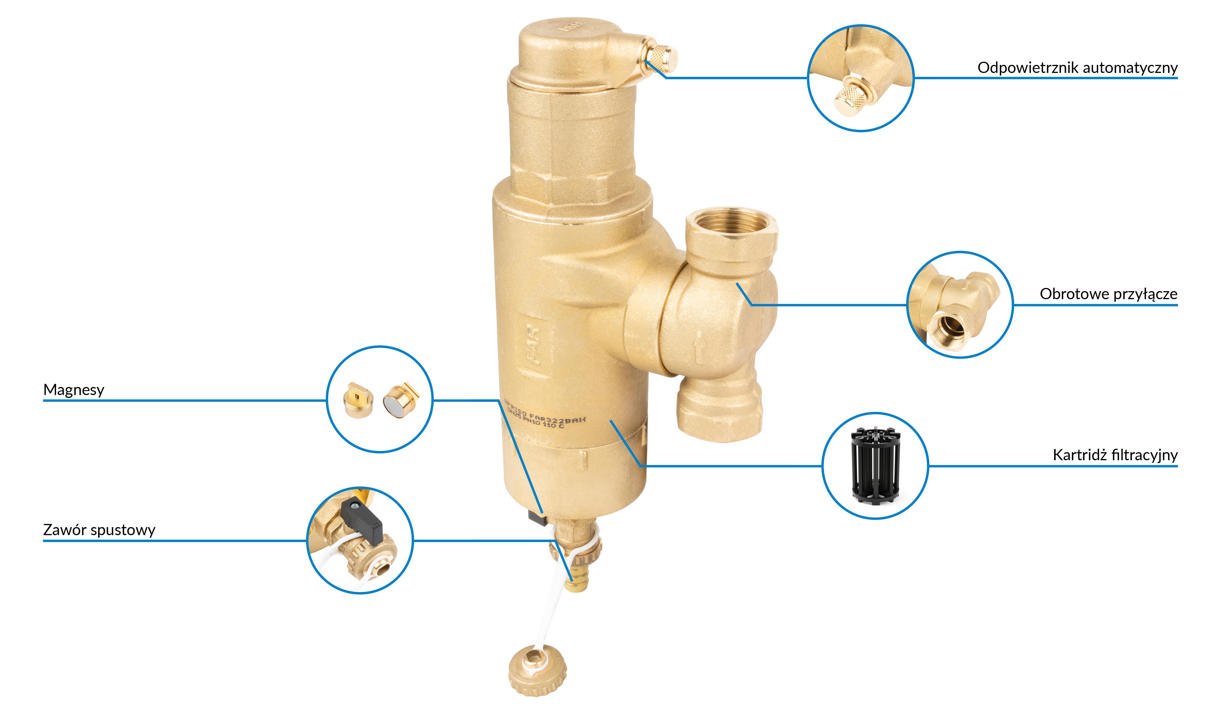 Zawór spustowy usuwa zanieczyszczenia wytrącone z medium.