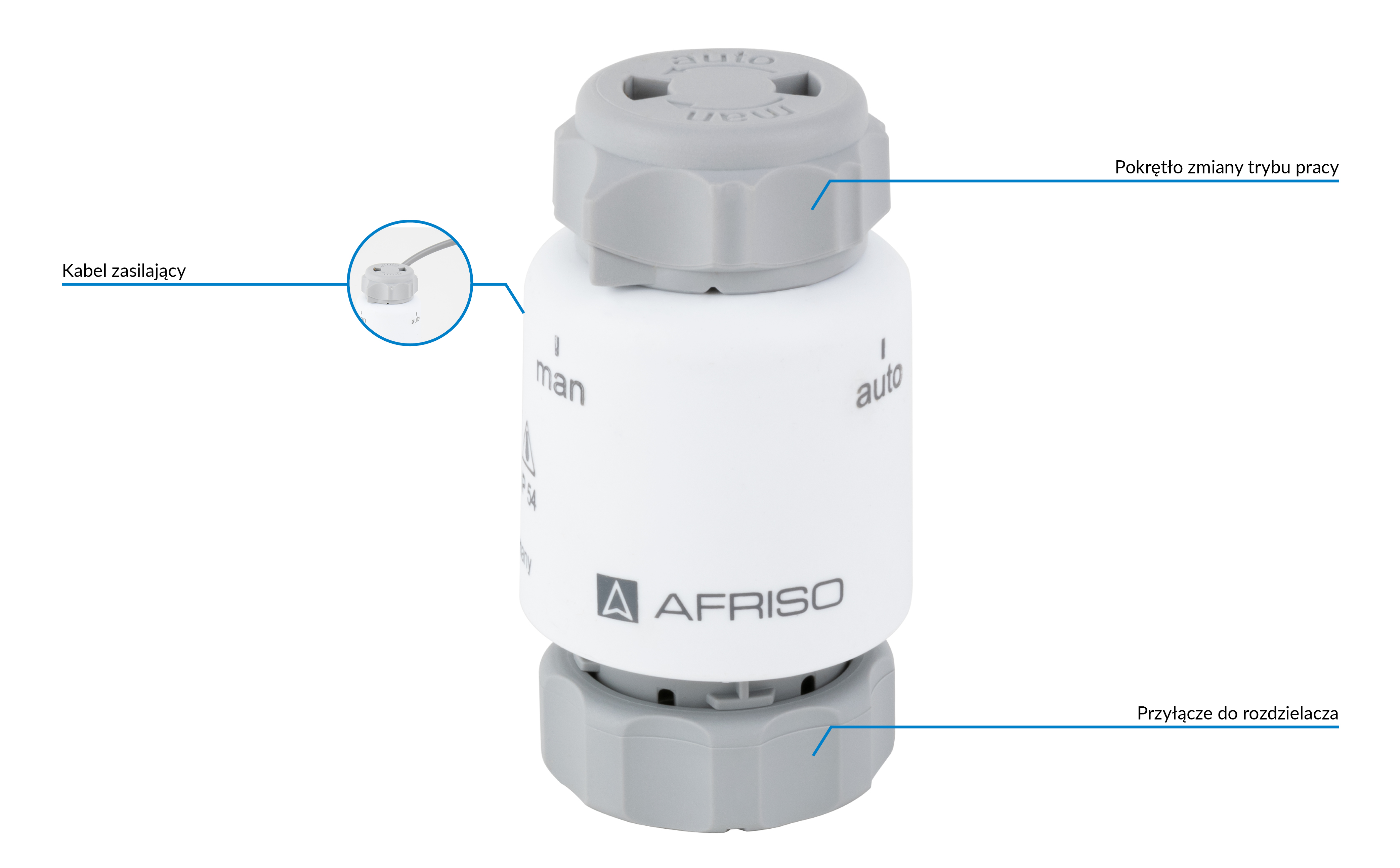 Pokrętło pozwala na pracę siłownika w trybie ręcznym (siłownik jest stale otwarty) albo automatycznym (praca zgodnie z sygnałem z termostatu/listwy).