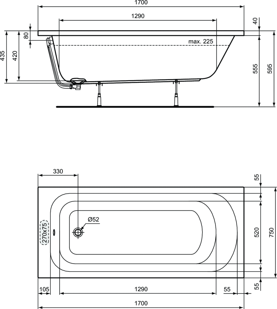 Wanna akrylowa Simplicity z bocznym otworem na syfon i przelew: Ø 52 mm. Wykonana z wysokiej jakości akrylu sanitarnego 3,2 mm z drewnianym wzmocnieniem konstrukcyjnym dna i krawędzi.