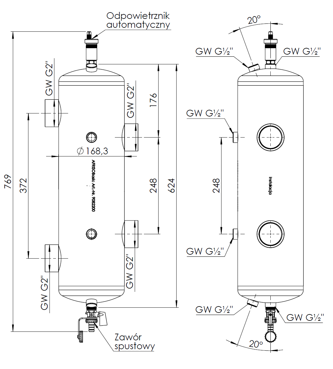 Sprzęgło hydrauliczne ocieplone BLH 822, 200 kW, 4x GW G2'', 6x GW G1/2'' odpowietrznik automatyczny, zawór spustowy, termometry, tuleja zanurzeniowa, korek