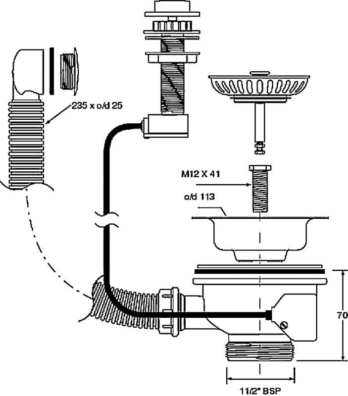 Spust zlewozmywakowy 11/2"x70mm z sitem ze stali nierdzewnej i korkiem automatycznym. Przelew z ujściem okrągłym.