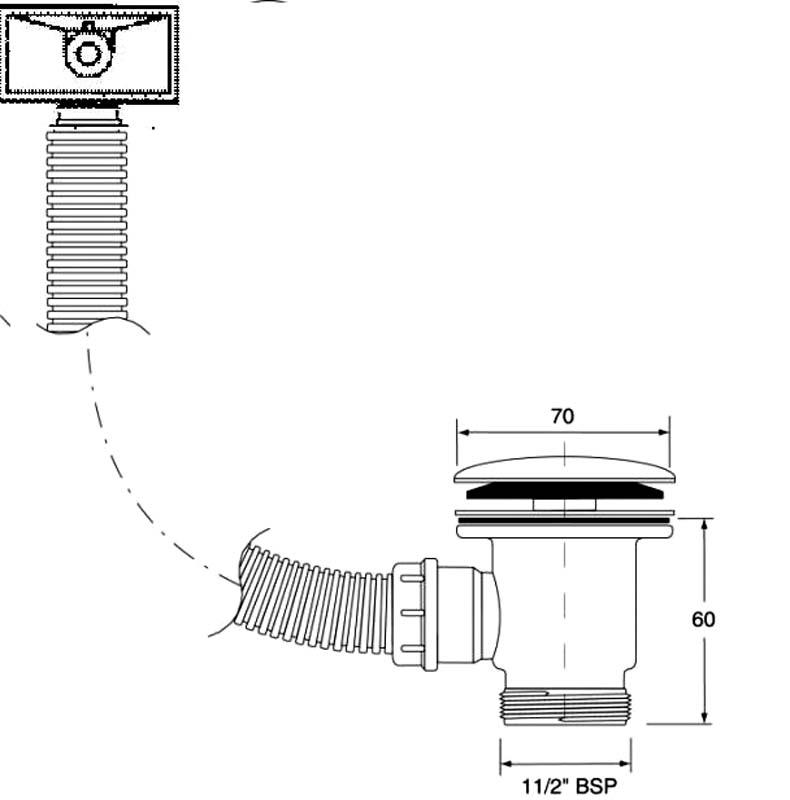 Spust zlewozmywakowy 1.1/2″x70mm z korkiem „klik-klak”. Przelew z prostokątnym podłączenie do ociekacza.