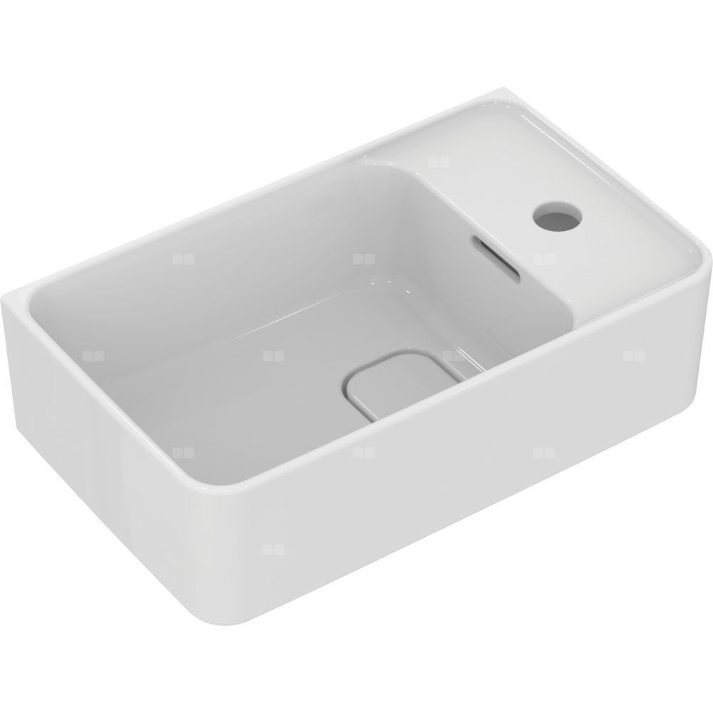 Umywalka Strada II do mycia rąk z 1 otworem na baterię, ze szczelinowym przelewem i korkiem o białej pokrywie. Do montażu z szafką pod umywalkę Adapto 43 cm lub samodzielnie z syfonem. Opcjonalny montaż z korkiem typu Click-clack z metalową pokrywą T3630AA.