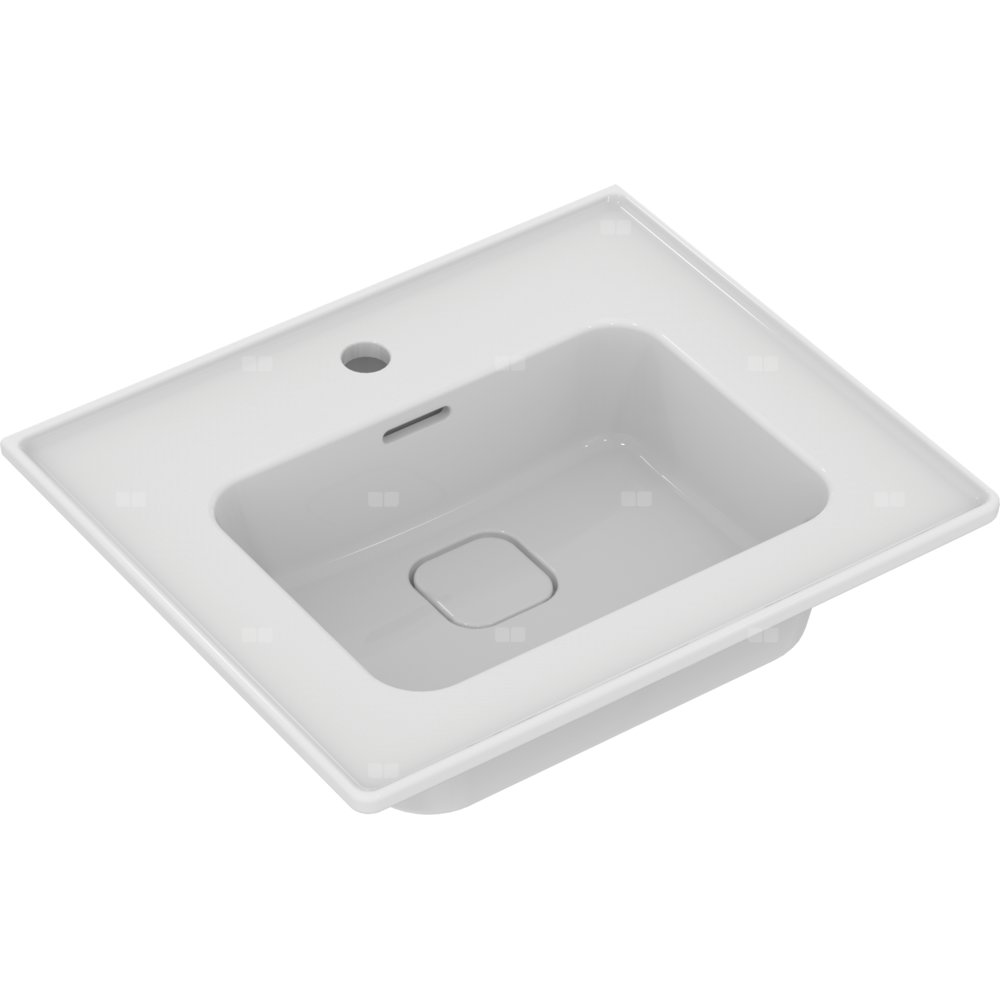 Umywalka Strada II z 1 otworem na baterię, bez przelewu i korka o białej pokrywie. W komplecie szablon do wycinania. Opcjonalny montaż z korkiem typu Click-clack z metalową pokrywą T3629AA.